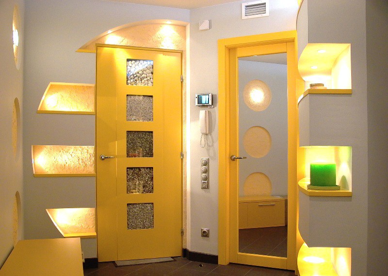 Halls of prefabricated houses, most often it is a long corridor or a small passageway with several doorways. With the replacement of doors, they usually start to install all the same or made in the same stylistic key. This will entail large expenses, but they will not need to be changed for 10-20 years.