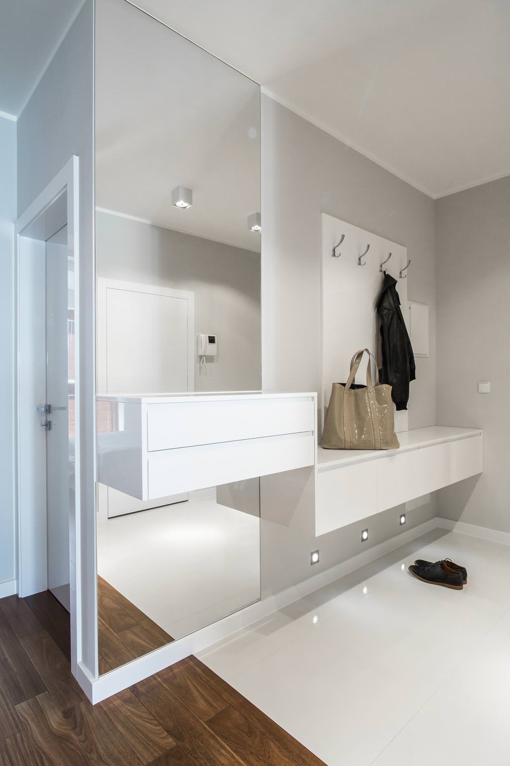 Light shades expand the room, and mirror or glossy surfaces push the boundaries even further, which is clearly visible in the photo.