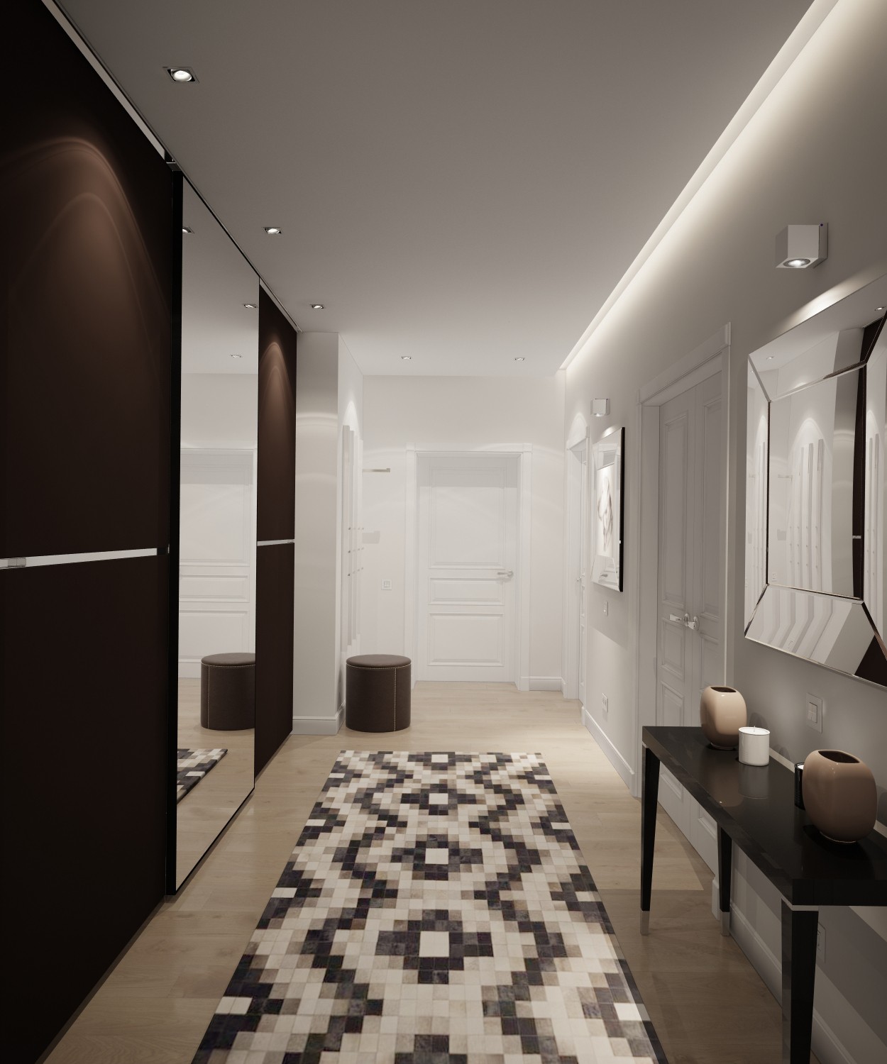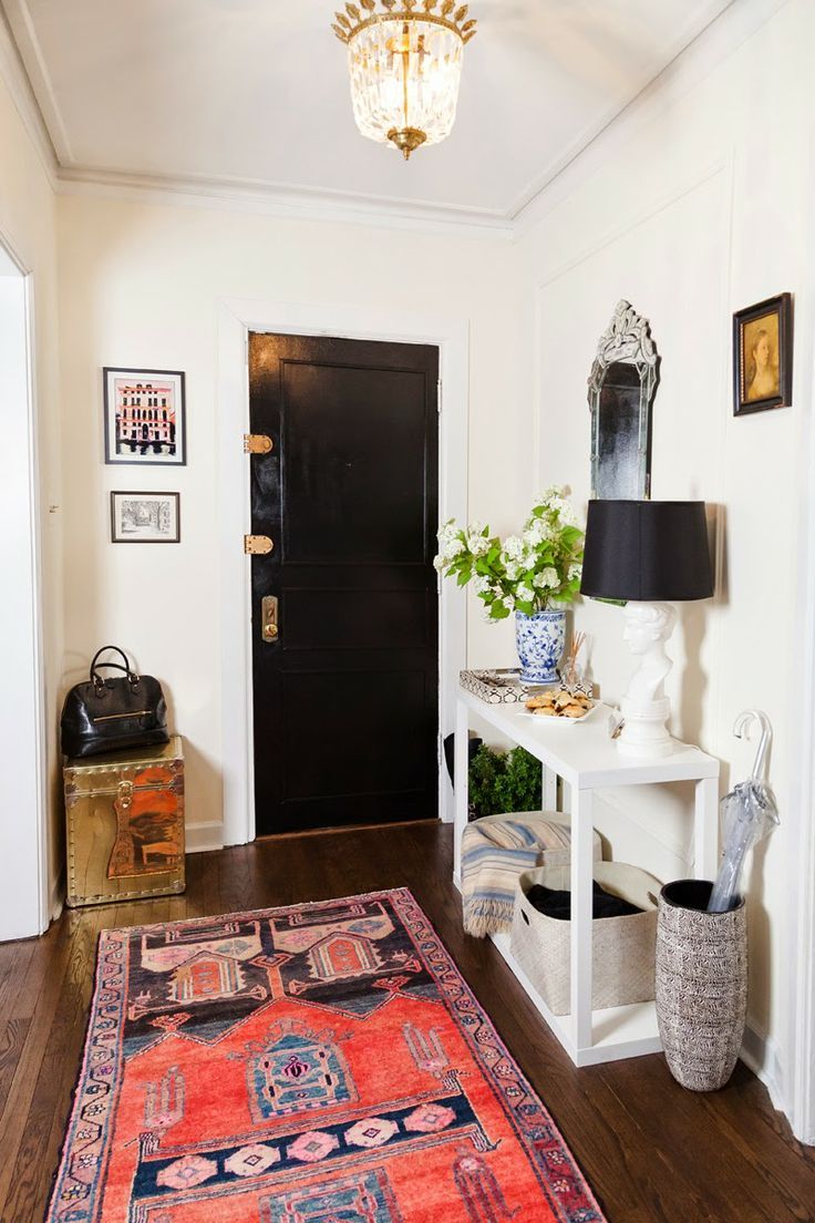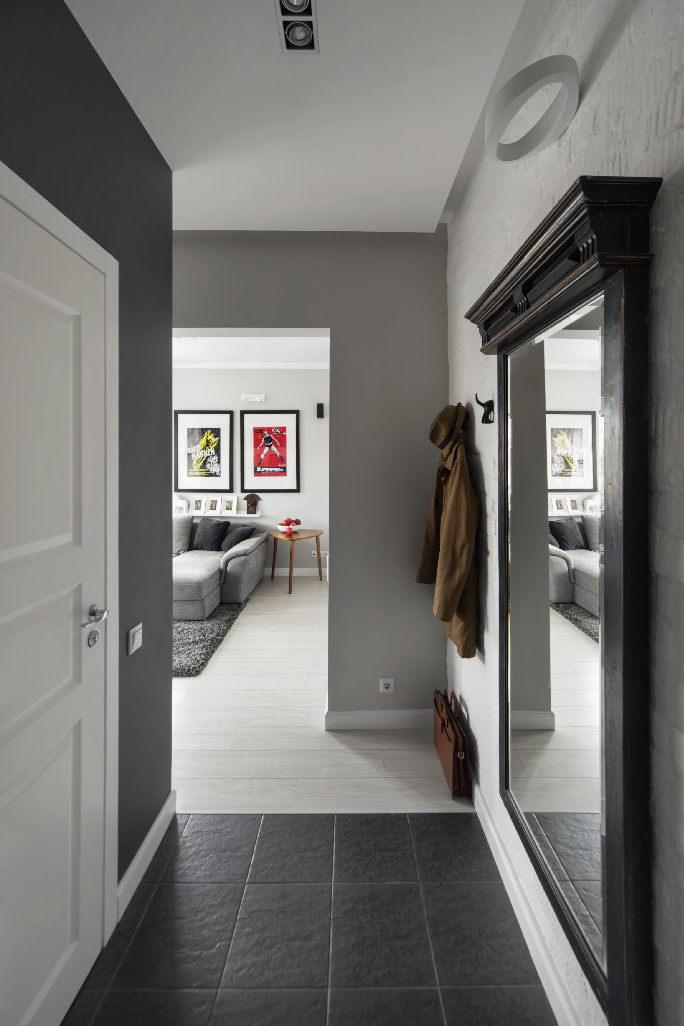 The narrow entrance hall can be adjusted by zoning with furniture, lighting, and decoration.