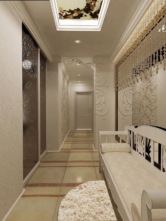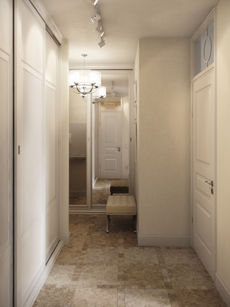 The wardrobe will only be at the end of the corridor, there is no other suitable place. An exception is a shallow built-in closet at one walk-through wall. It is better to equip it not with swing doors, but with sliding doors to occupy less space. The modern solution is the wardrobe department with internal diode illumination.