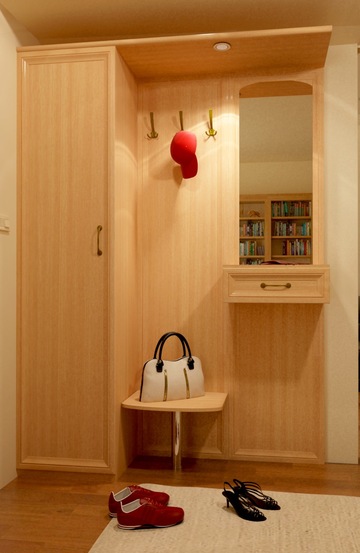 Design Council: As little furniture as possible! Do not deny yourself a comfortable seat, but a padded stool or a shoe shelf with a folding soft top can replace a bench. For this comfort attribute, there is always a place along the free wall, with the exception of the corner at the turn.