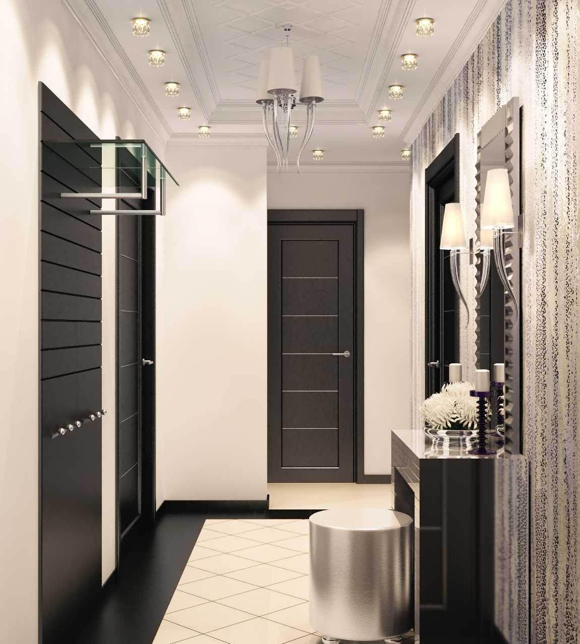 Good lighting, an abundance of light shades and contrasting accents will help visually expand the small corridor.