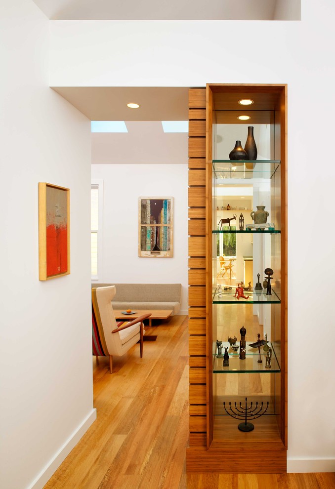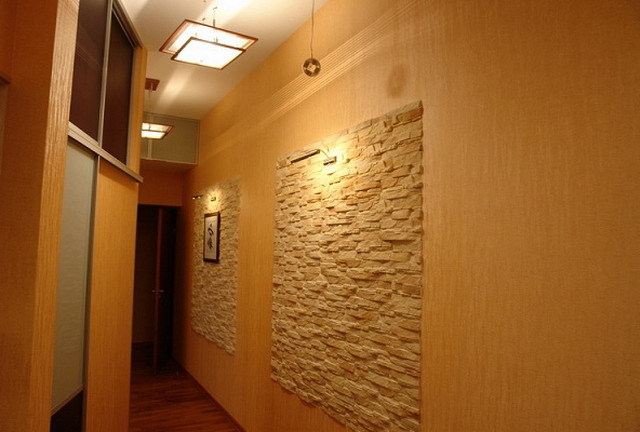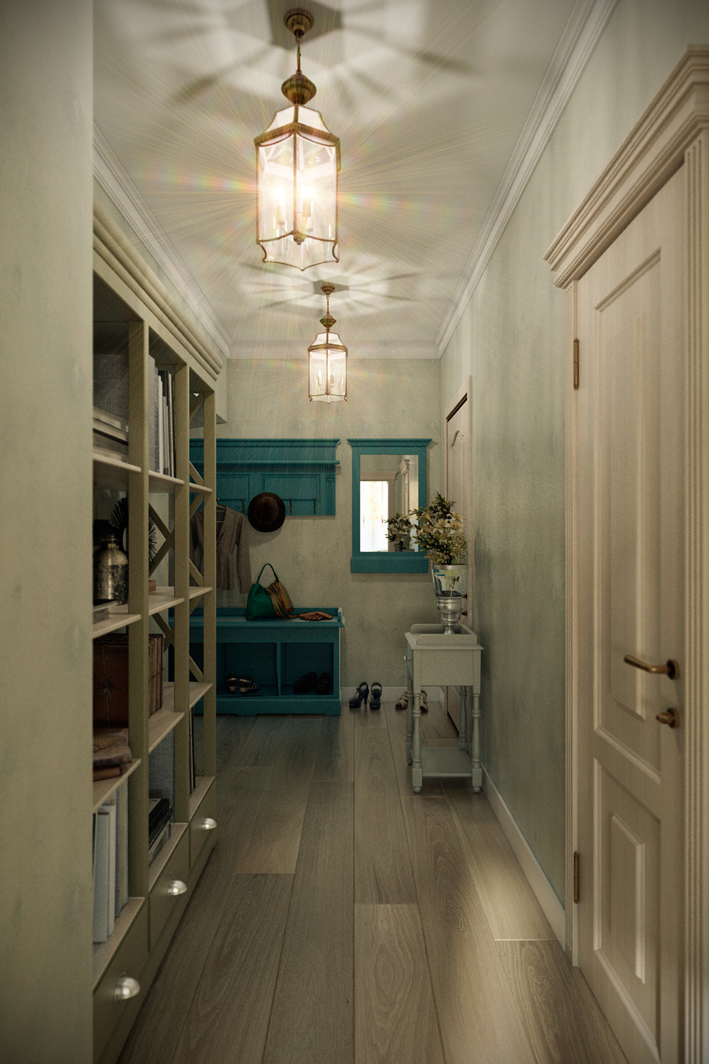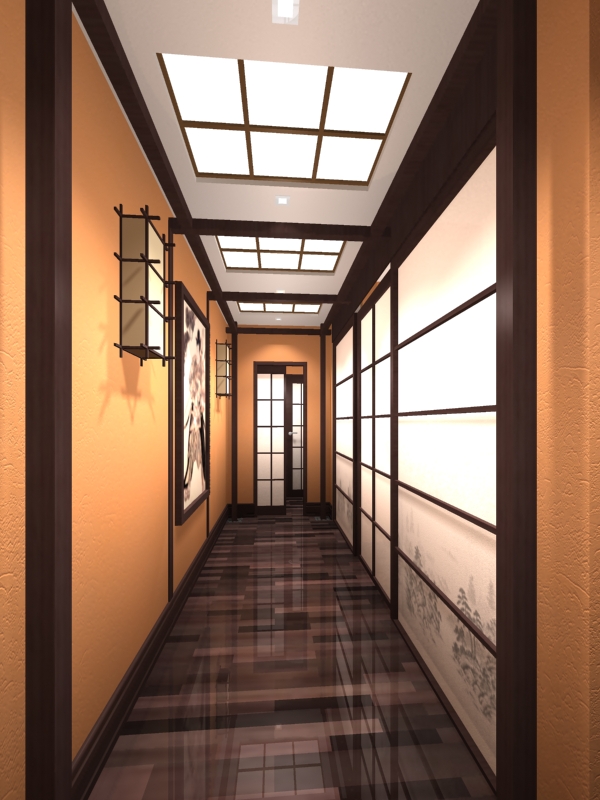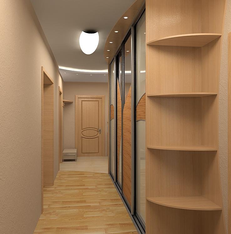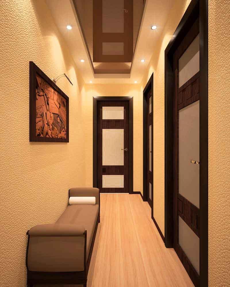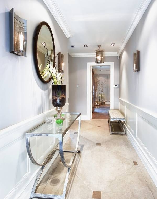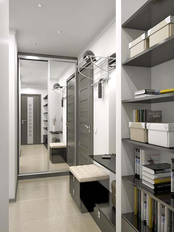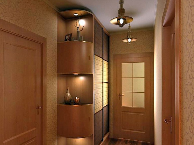 To increase latitude, a mirror is hung on one wall, and a lamp is placed on the opposite side. If the corridor is very narrow, wall accessories should be minimized so as not to interfere with comfortable movement.