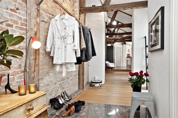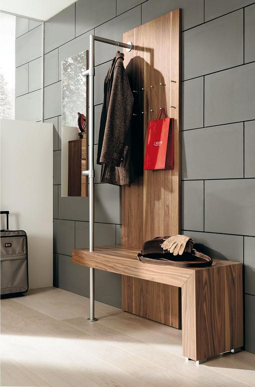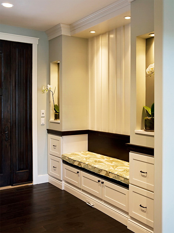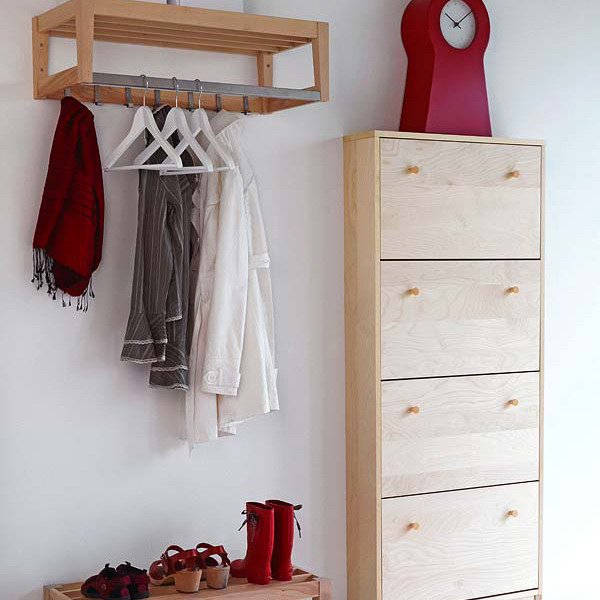 An interesting idea is the built-in niche for outerwear with a convenient bench for shoes