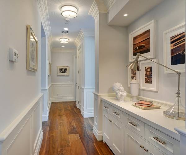 The key task in this situation is to transform the existing tunnel into a place of convenience and functionality. The design of the long corridor depends on the final result that the owners of the house want to get. Many factors should be considered, including the presence of pets. This will help you choose the right finishing materials. If there is a cat, then do not paste over the bottom of the walls with wallpaper.