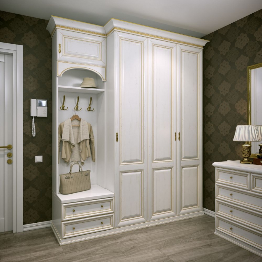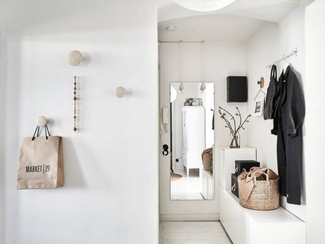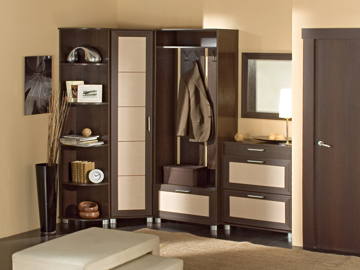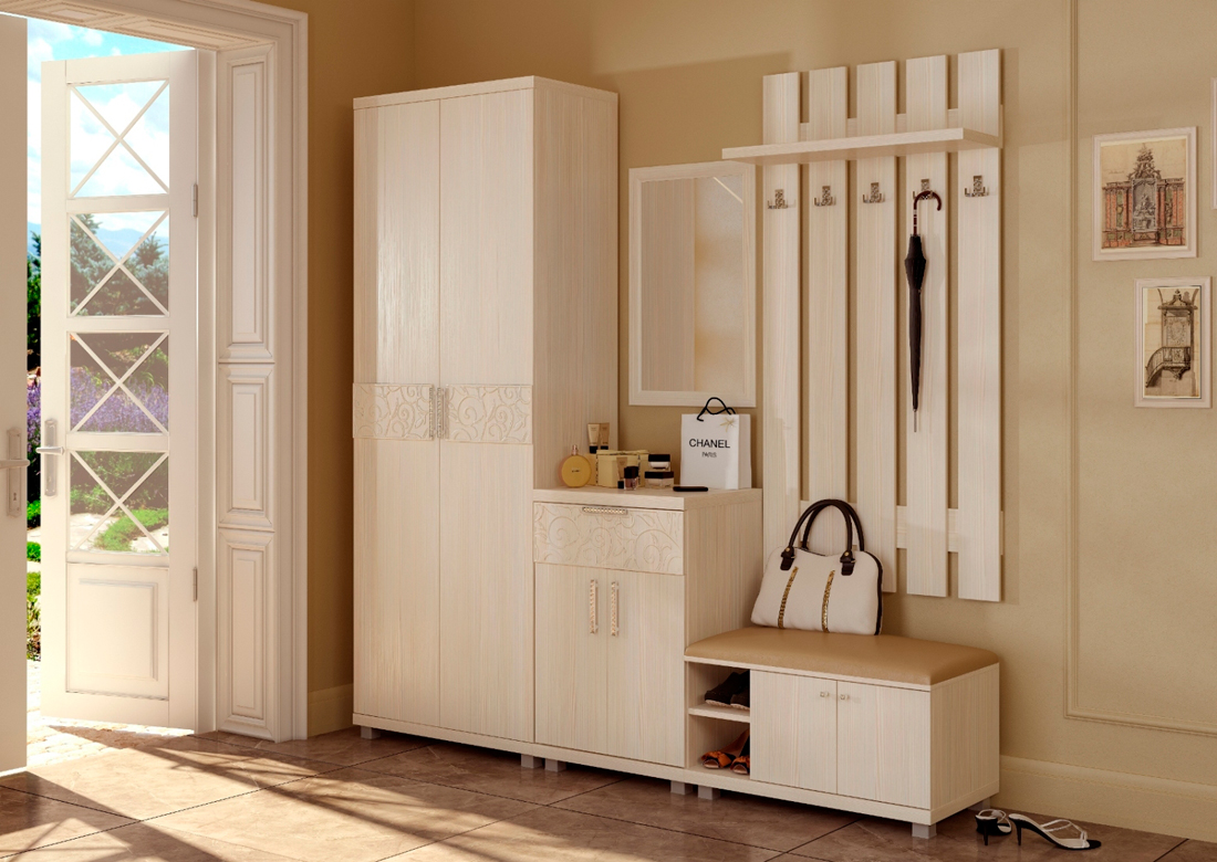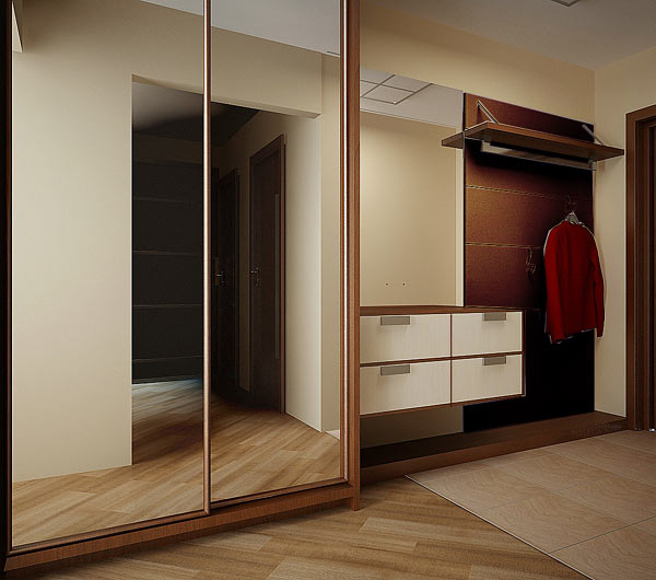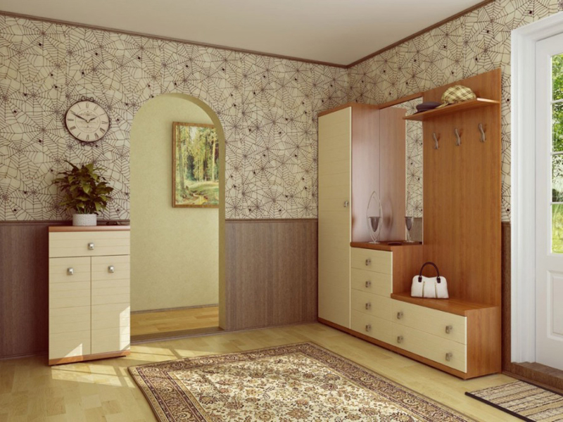 Cupboard. It is necessary to place outerwear and shoes. You can put on a wall and a hanger, but it is better if the clothes are hidden from prying eyes, so you get the most harmonious look. The most convenient view is a wardrobe. It does not take up much space, but it contains all the necessary elements for storing things.
