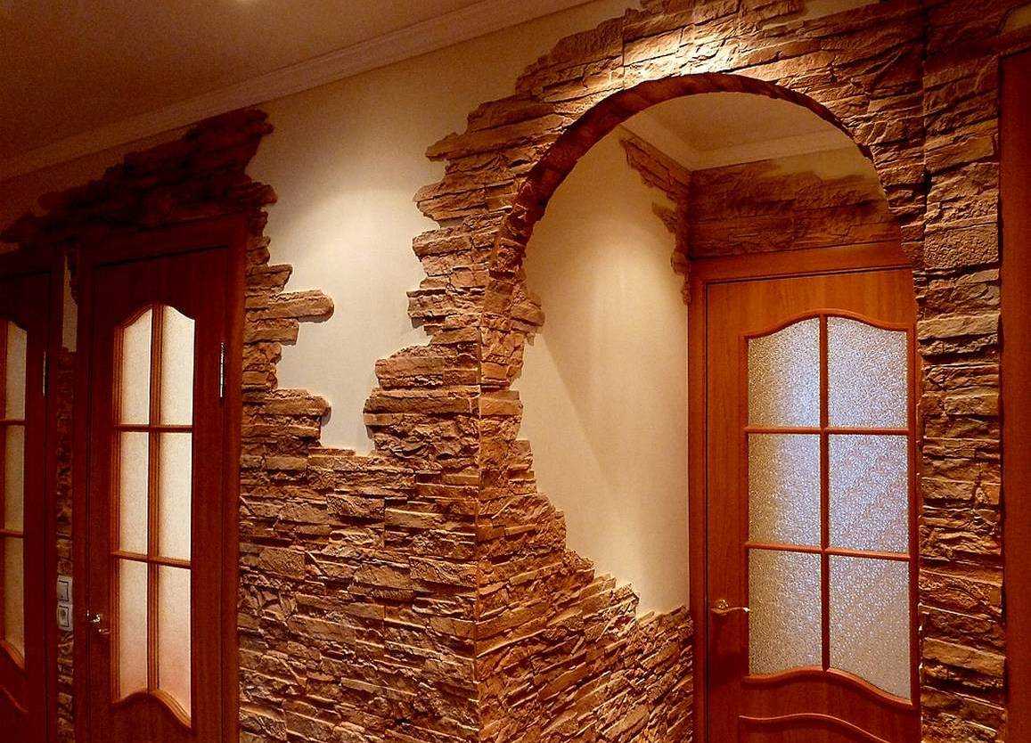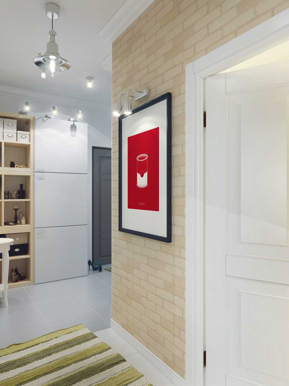 Decorative facing brick or “wild” stone on a part of the wall is a noble decor of the hallway in the apartment. It is not necessary to lay out the entire wall, artificial masonry is enough in one corner, near the front door or between the interior doors.