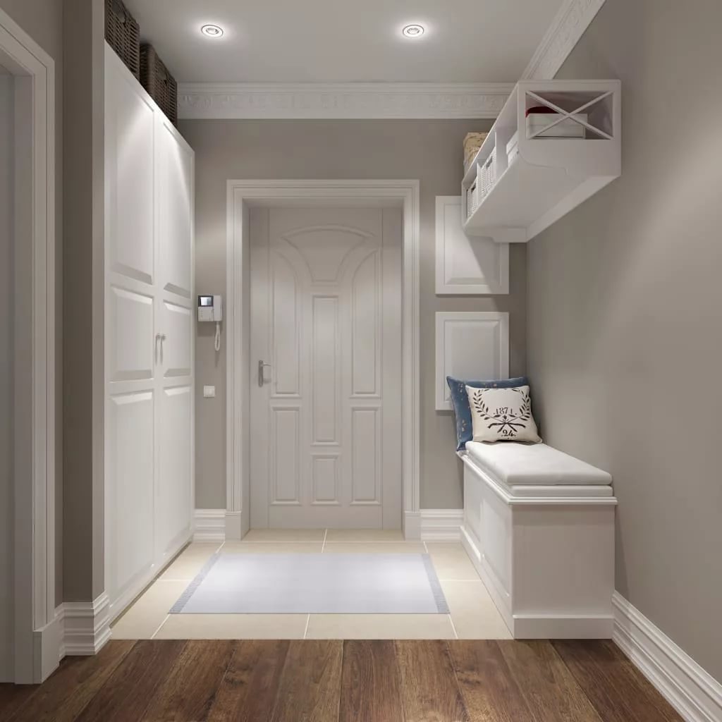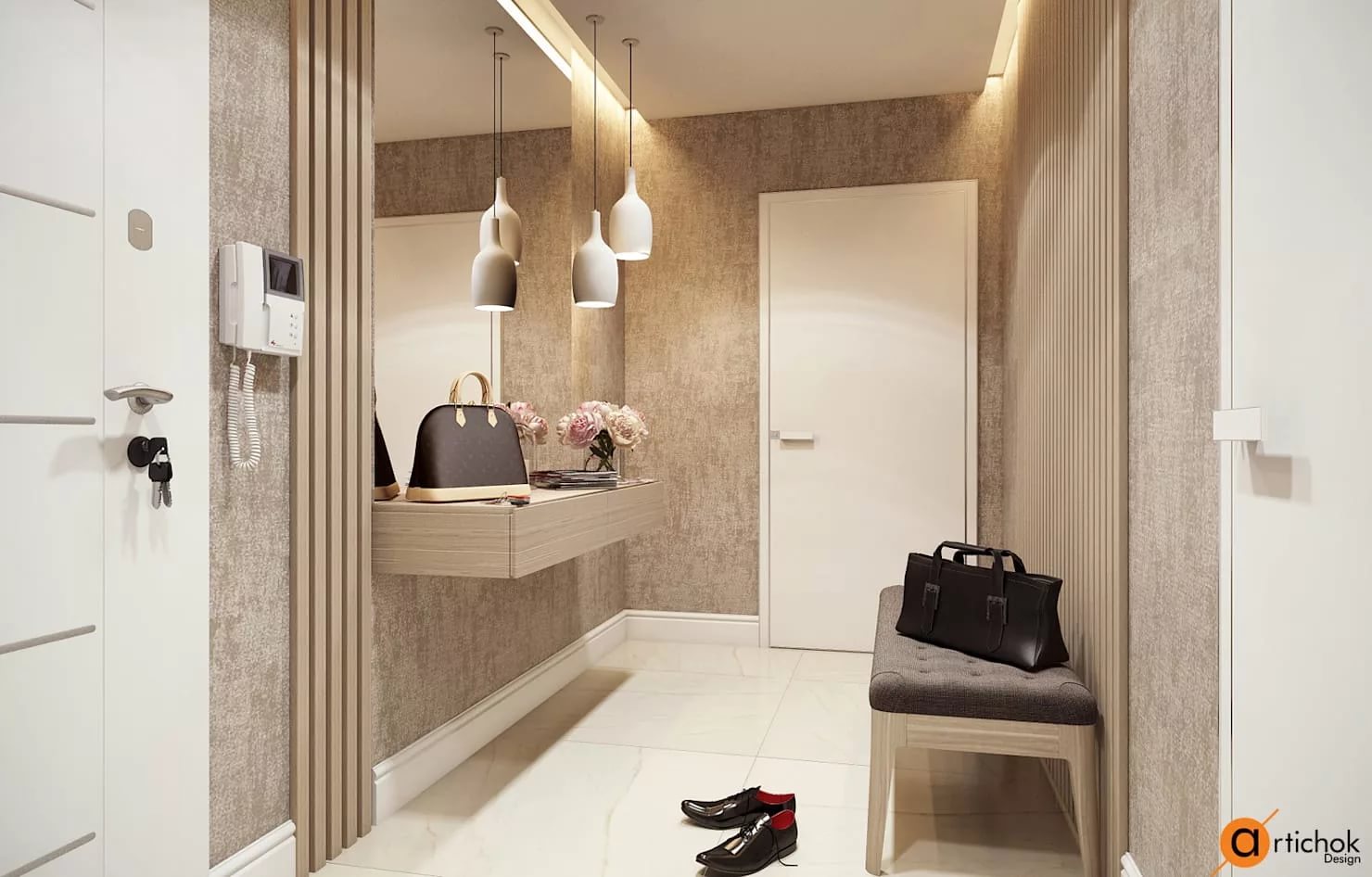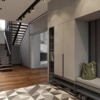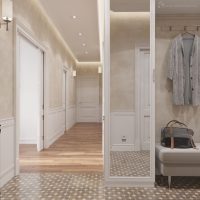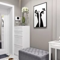 The combination of modernity and comfort. Such a hallway must be bright. Natural patterns, small floral prints, as well as natural shades will look organically.
