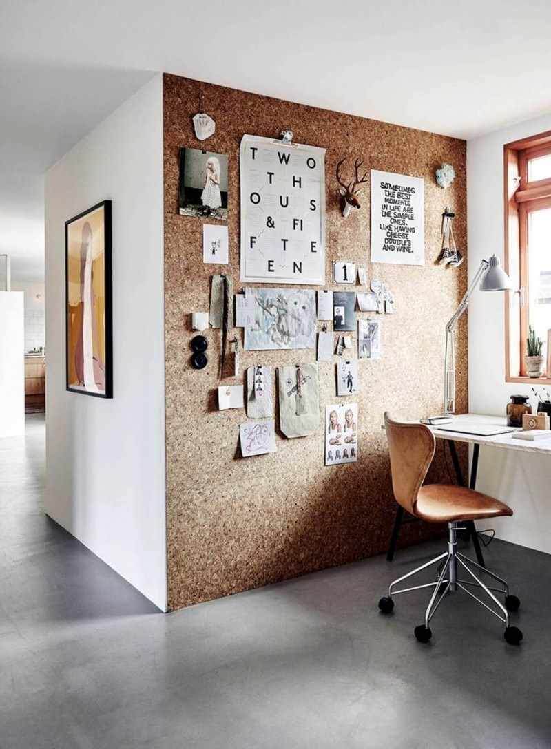 Cork is a material made by special technology from oak bark. In the process of processing, the bark passes through several stages and turns into a kind of powder, from which you can create any kind of objects with unique properties. Recently, more and more often cork in the interior is used precisely for the manufacture of finishing materials. It looks modern, stylish, perfectly in harmony with any style.