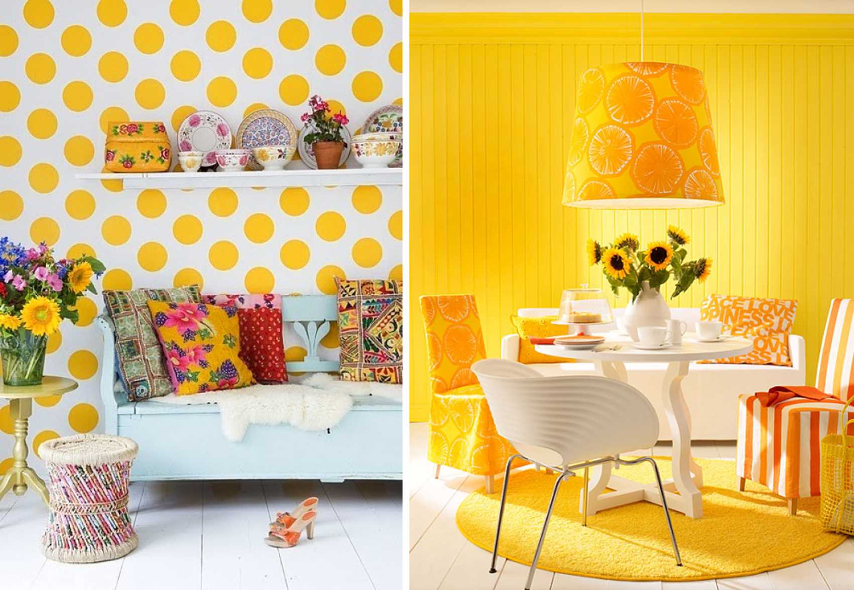A life-affirming color is associated with fireworks, a sunny beach. It stimulates the brain, gives a sense of celebration. Light, blinding tone will create a comfortable atmosphere, bring a sense of vigor to the room.