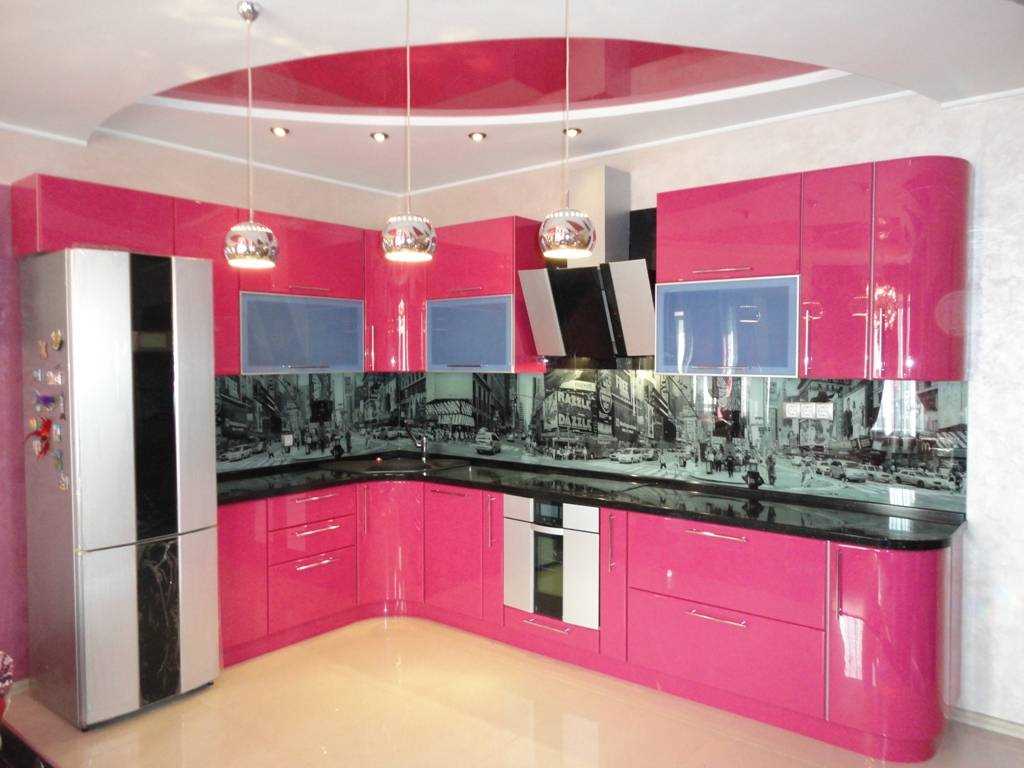Pink color in the interior of the kitchen will increase appetite. It is allowed, but with caution, to work with saturated tones - fuchsia, raspberry. They will tune in a positive way, improve mood. For calmer families, neutral pastel lilac, light pink are suitable. The perfect complement would be chrome kitchen appliances, furniture elements in white.