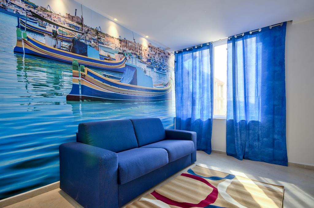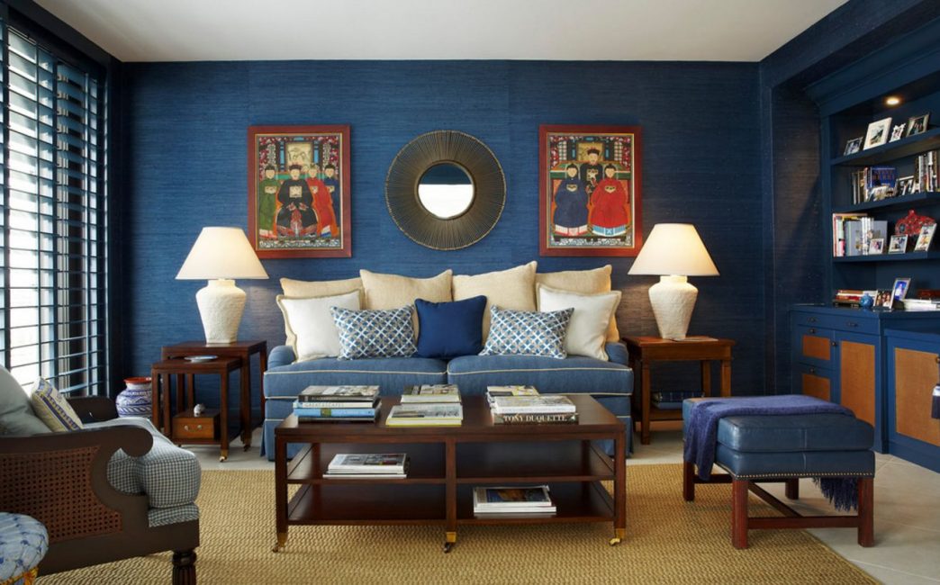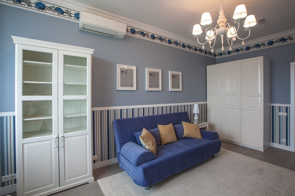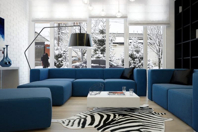 If the living room has massive furniture in blue tones, then it must be diluted with pillows, lamps, vases, covers of other colors.