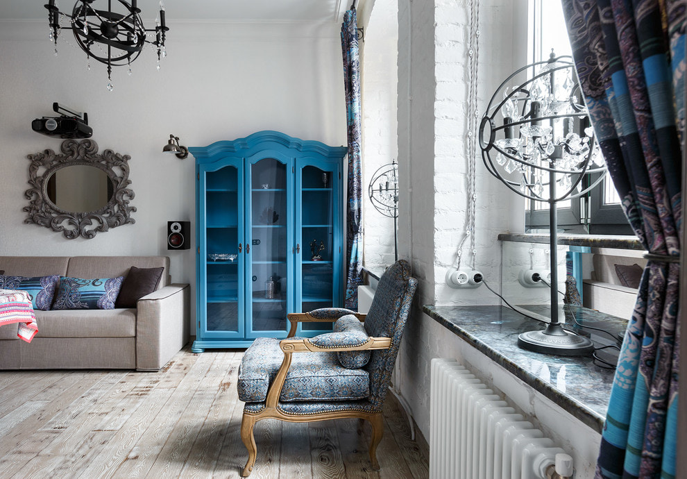 When drawing up a design project, you need to pay close attention to the lighting of the room. This is especially true for the office, living room. The main chandelier can be supplemented with small, spotlights, sconces, and a floor lamp. Blue perfectly complements the interior of the room, decorated in an oriental style. Blue shades will raise the ceilings higher. If you want to visually expand the room, you can paint one of the walls in natural blue, the rest in more neutral and calm colors.