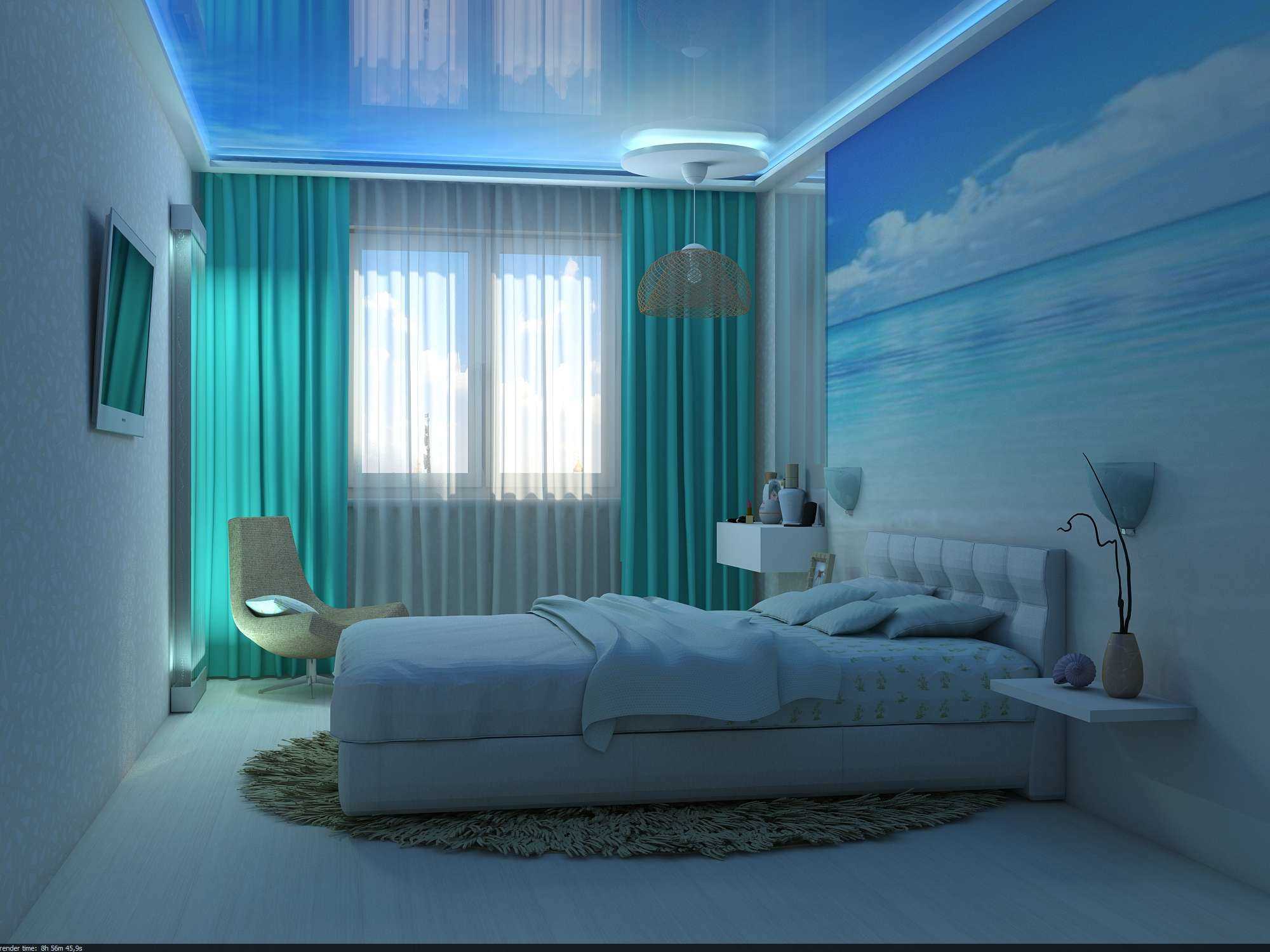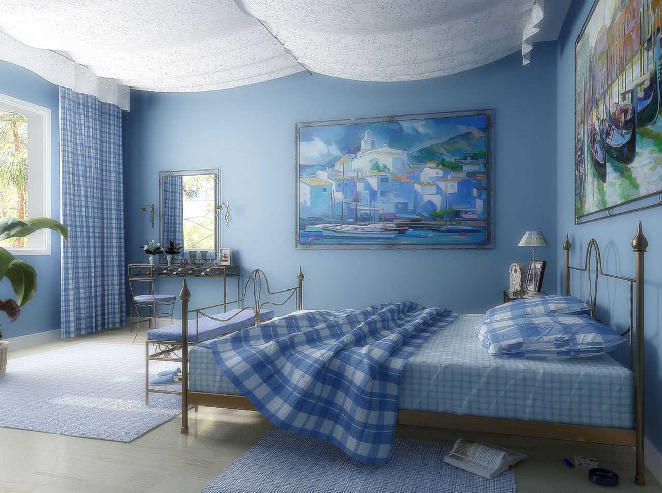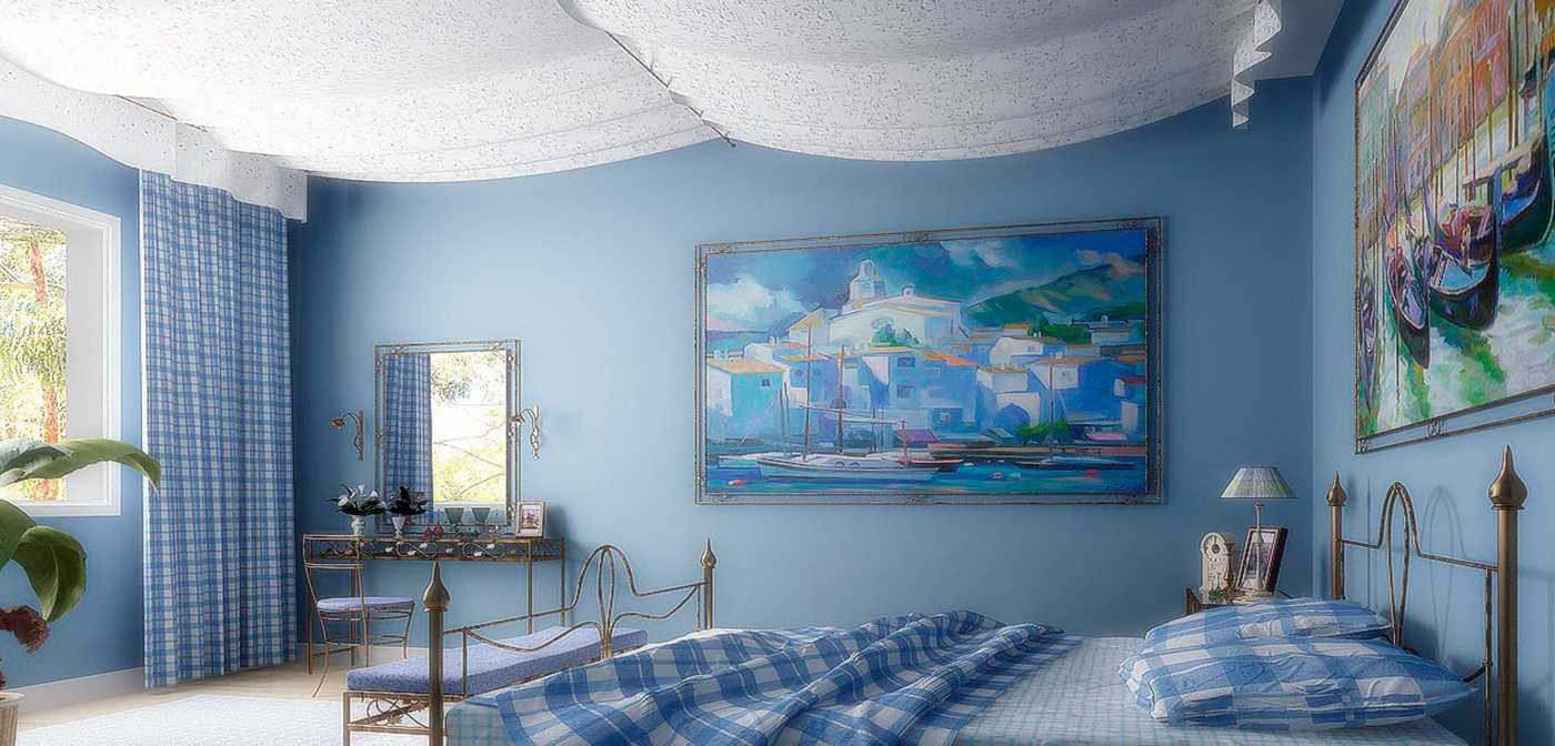 The blue color in the interior of the bedroom will create an atmosphere of calm