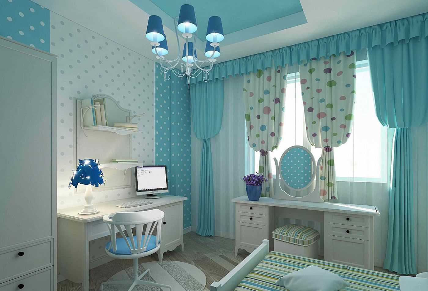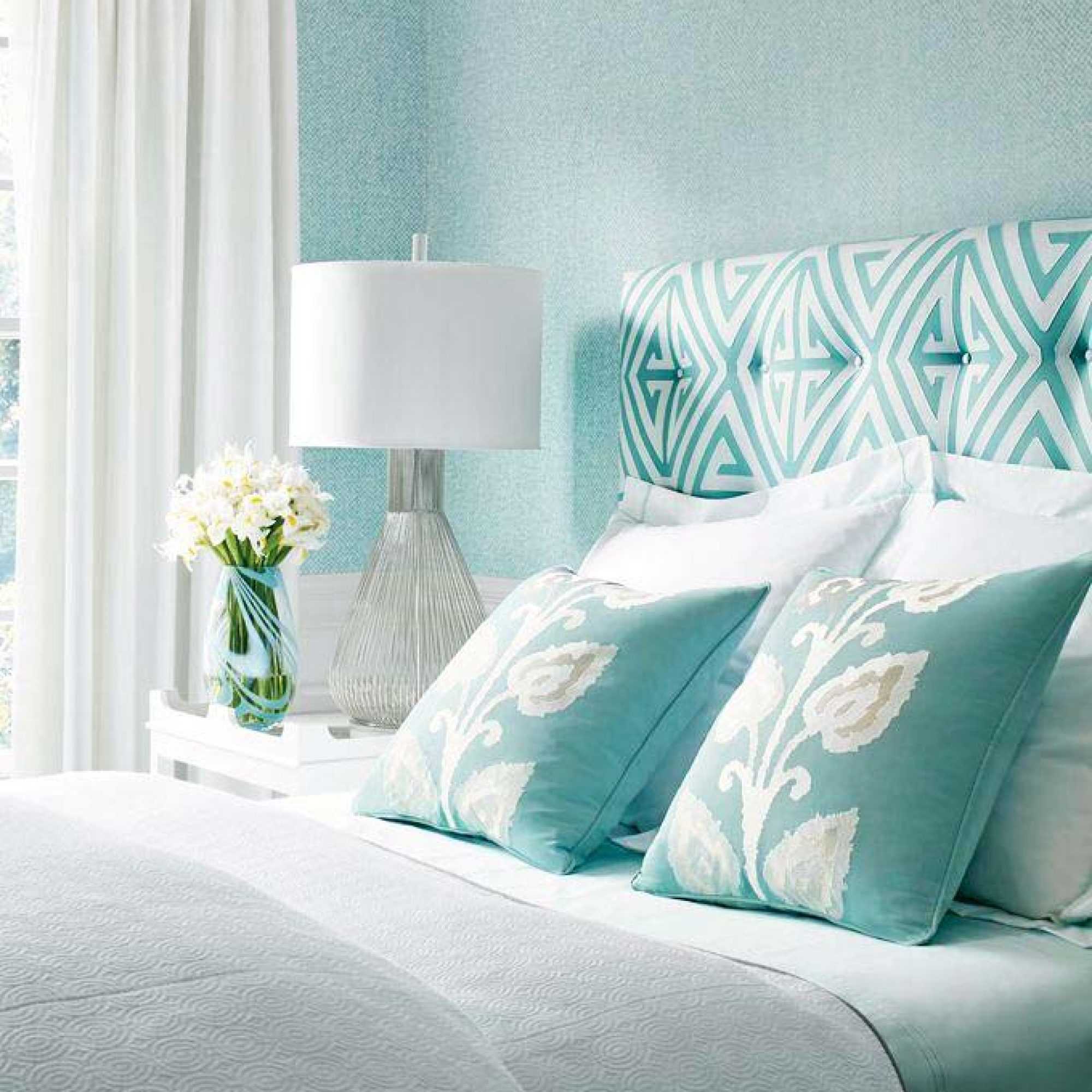 Using this background in the bedroom will create harmony. Icy notes will help to tone up and relax faster. For this purpose, combine it with gray, purple, green. Use black to highlight accents, dilute this coolness with soft-colored furniture, and a stylish harmonious interior for relaxation is ready.