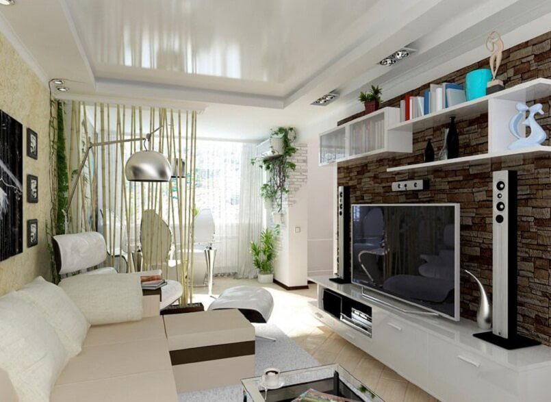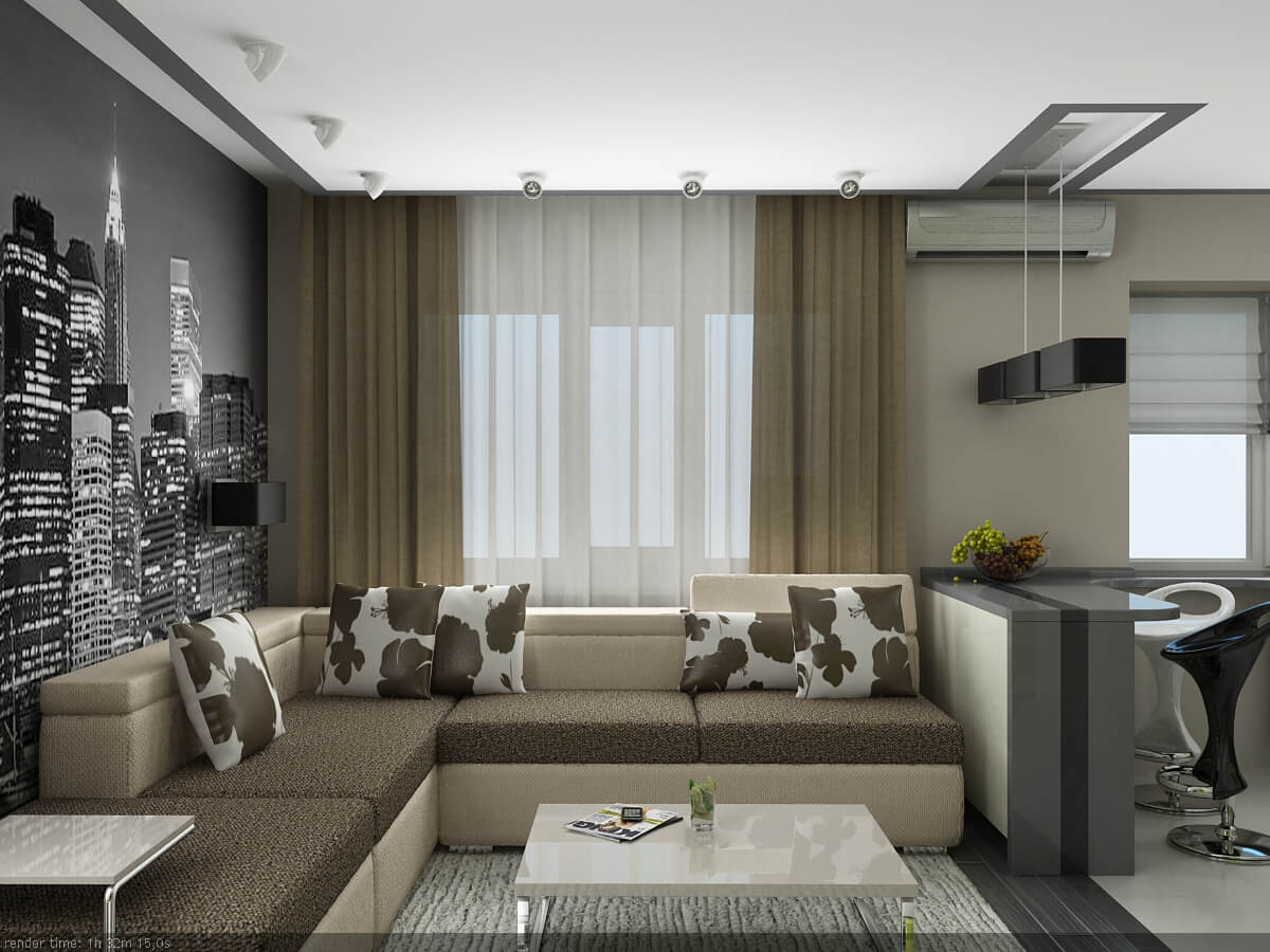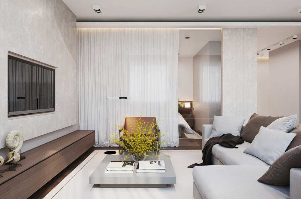 The most difficult is the competent organization of the space of the main living room. The interior of a one-room apartment implies one stylistic decision. It can be minimalism, hi-tech, classic. But zoning will still have to be done.