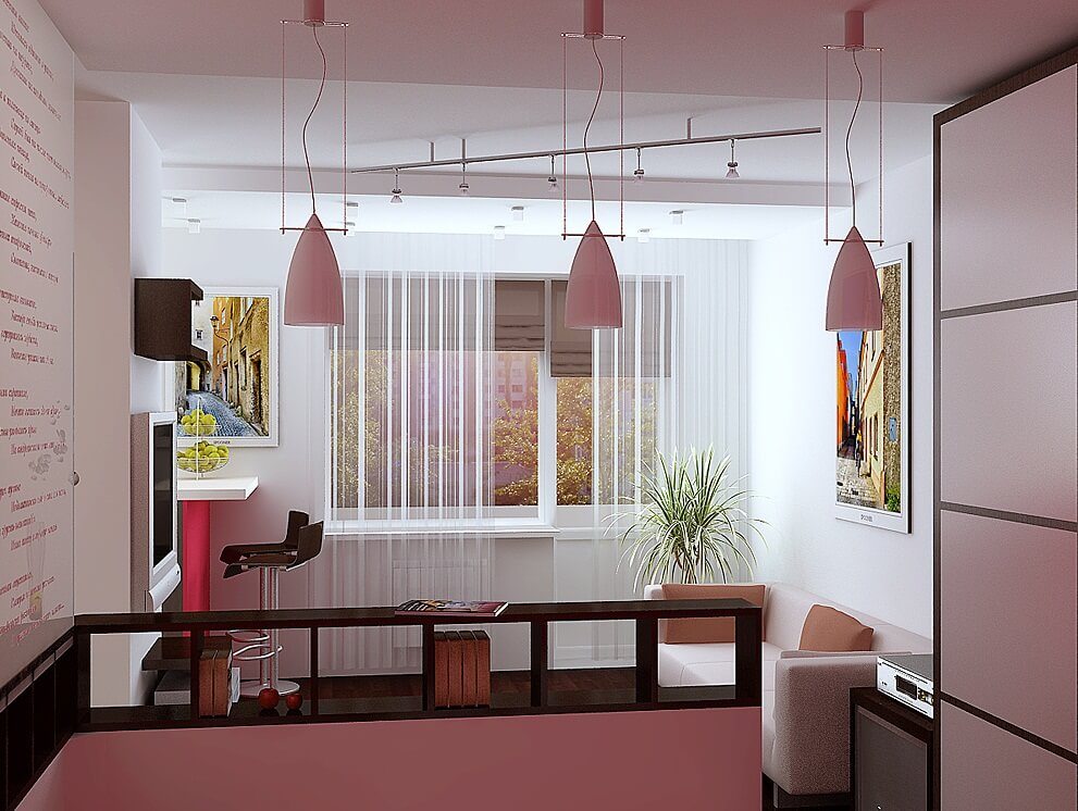 The podium can also be built on the balcony, most of the seasonal items will be stored there, replacing each other. It is better to hang open type shelves on the mills. Near the bed you can put a table that can "grow" and move apart.