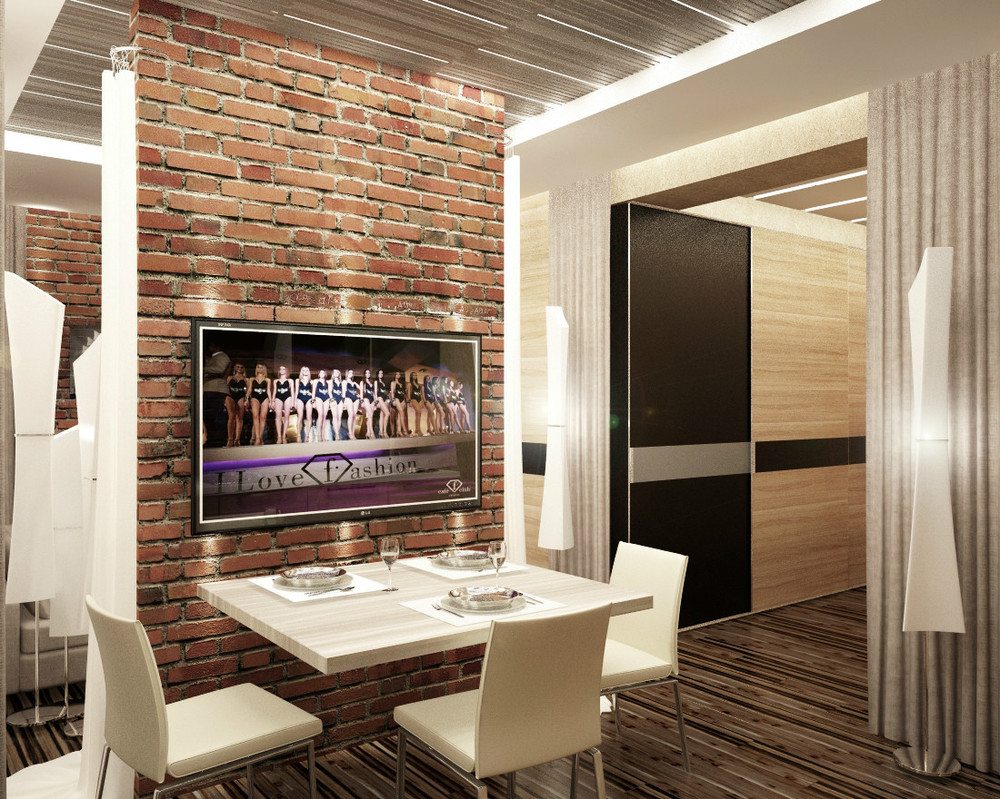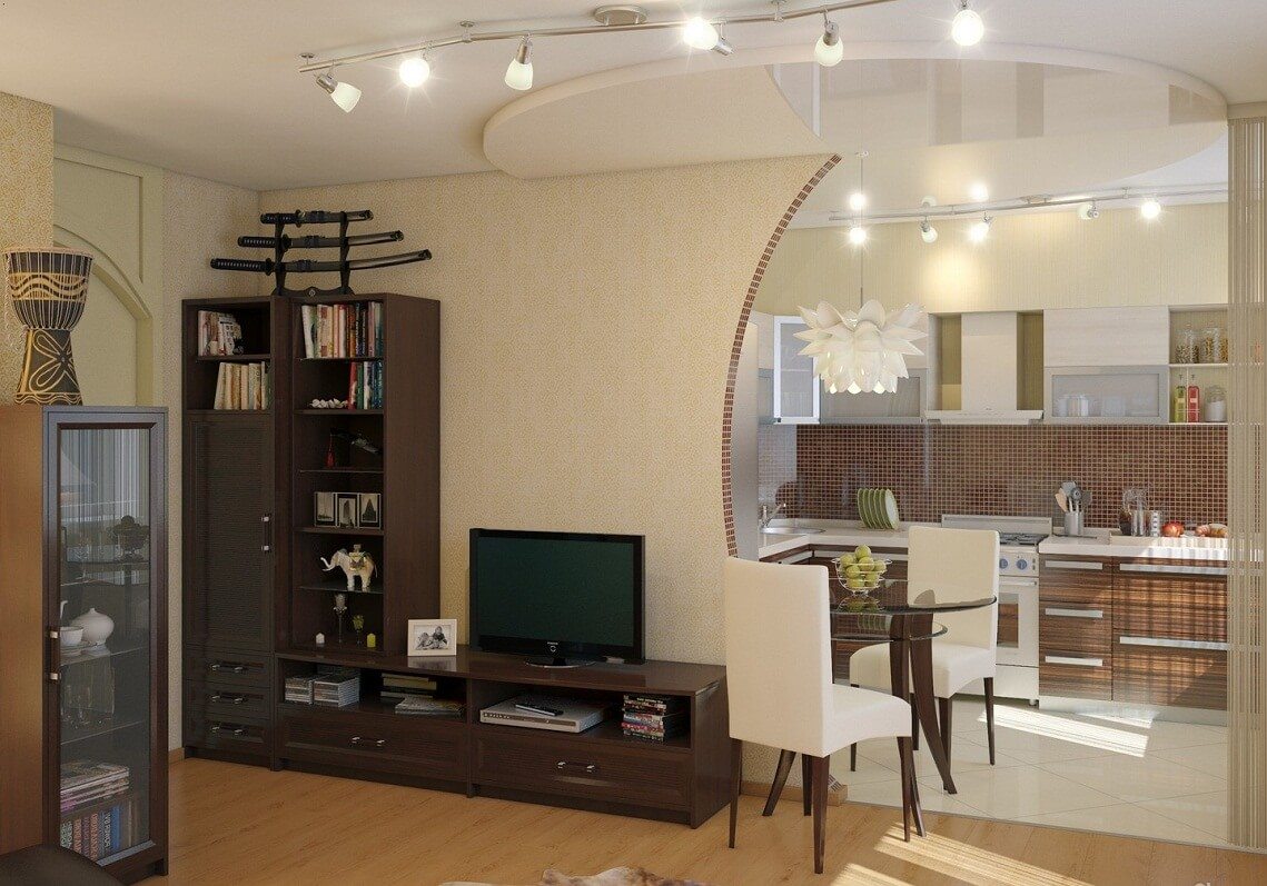 If the apartment is in a new house, then redevelopment can be done without any problems. The most suitable option is a studio. Here, the space separating element may be a bar counter. Also plays the role of a dining table. Or additionally install a transforming table in the kitchen. It can serve as an element for eating or, when folded, a coffee table.