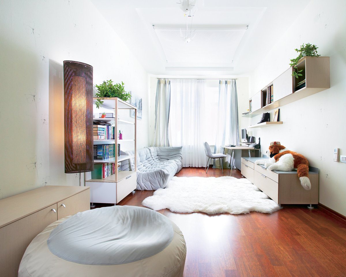 All furniture should be multifunctional. It is not necessary to install everything along the walls, strictly in one line. Highlighted islets and podiums are welcome here. For the baby, an attic bed is an ideal option. In the free lower part you can install a roll-out table, a small built-in wardrobe. A full bed for adults cannot be put on, only a sofa. But, if you search well, you can buy a model with an orthopedic mattress.