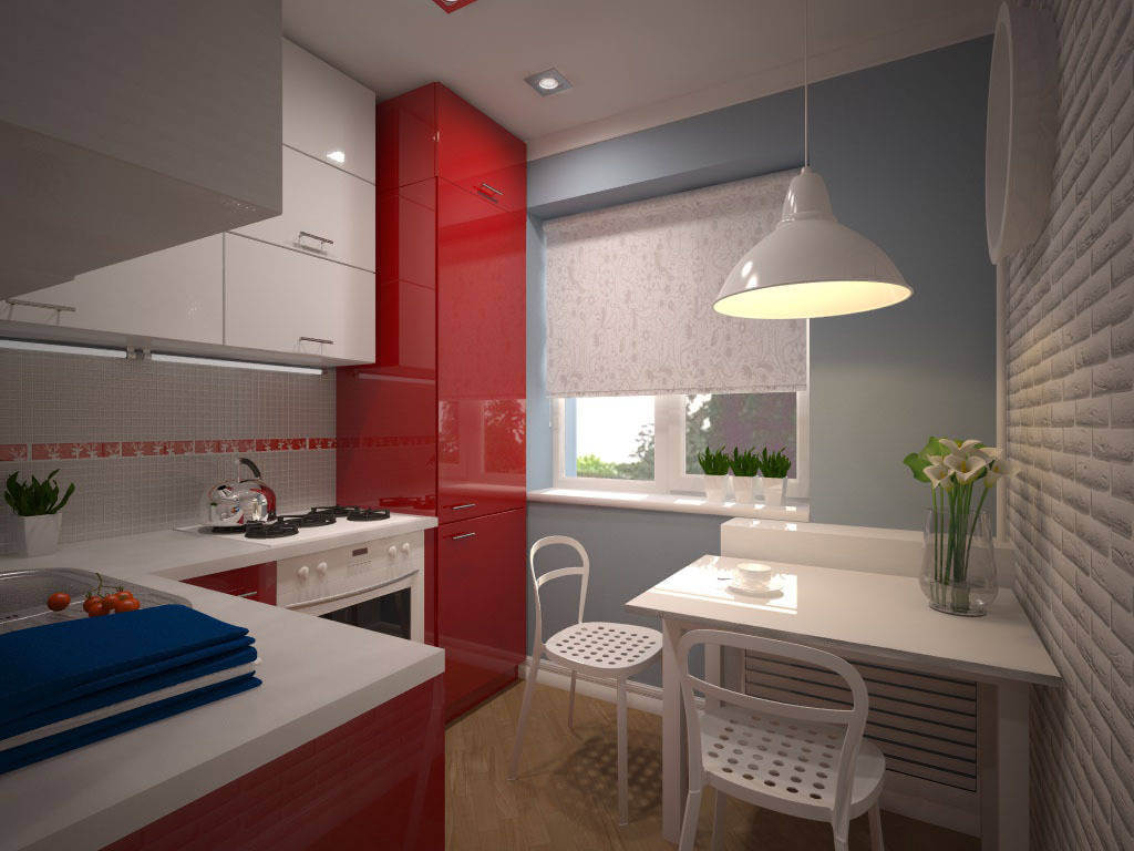 The dining area needs to be organized by the window, preferably a table model that is attached to the wall, folds if necessary. A window sill in a small kitchen is not for flowers. It should perform more serious functions. If a wide option, it can be a table or a continuation of the working area for cooking.