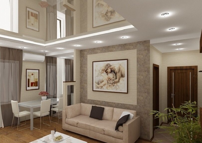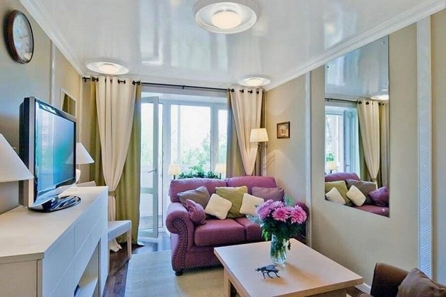 | Lightweight, airy interior | To visually increase the space, you can use mirror surfaces, zoning using partitions of light, translucent fabrics, thin, strong glass. If partitions are not needed, zoning can be done during repairs. An important point here is the competent selection of finishing material. The floor in different areas should vary: in the kitchen - tiles, living room in the laminate. In the sleeping area you can lay a fluffy carpet. Each zone should have individual lighting. |
