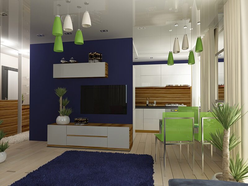 | Accent | Do not use only dark or light colors in the interior of a studio apartment. There are 2-3 main accents. For example, a dark shelf and light walls, or, walls and ceiling are light, and the floor is saturated, dark shade. But, do not use a lot of dark, visually it will reduce the room. |