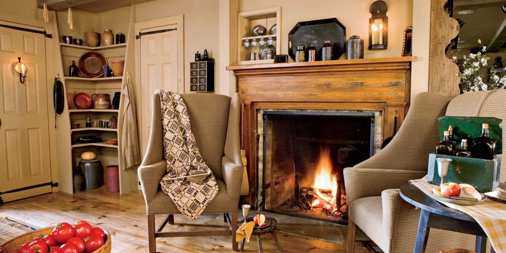 The design of the living room, in general, is close to the interior of the kitchen: a whitewashed ceiling, light wallpaper. Vases or large flower pots are often placed on the windows, so the curtains should be up to the middle of the window. An interesting solution would be windows with internal shutters. An important element of the interior of the living room is the fireplace.