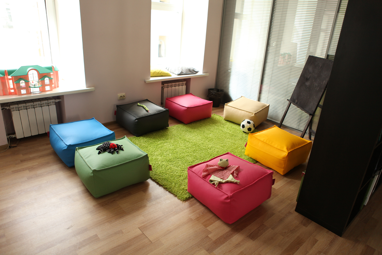 - If there is a place for receiving guests, it is better to arrange it with upholstered furniture with low backs. A few rounded pouffes, a small coffee table on wheels is enough.