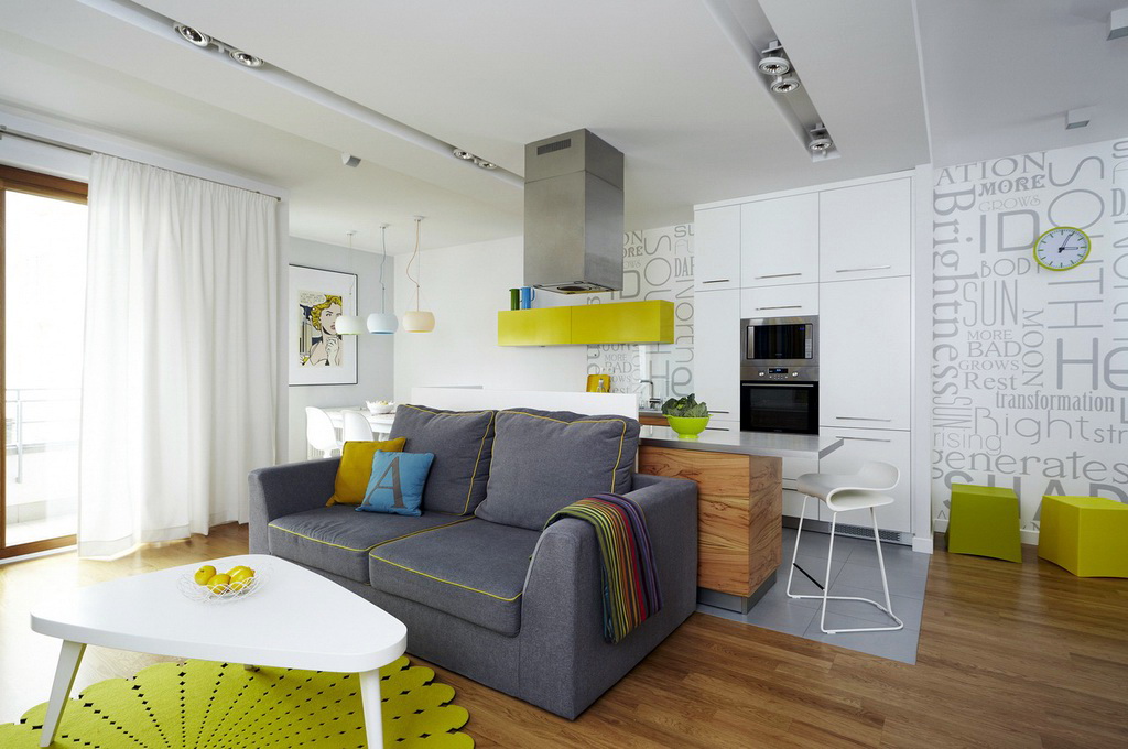 | Finish | You can separate the kitchen from the living room-bedroom by using different finishing materials, colors. In the kitchen, it is better to use tiles, in the residential part of the room - wallpaper, decorative plaster, paint. |