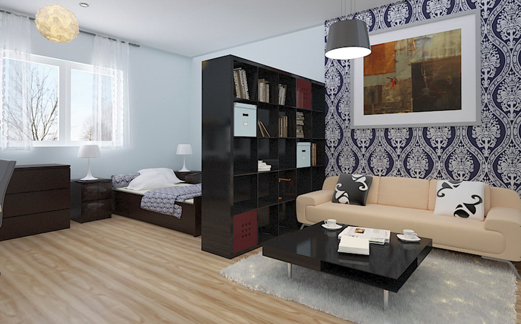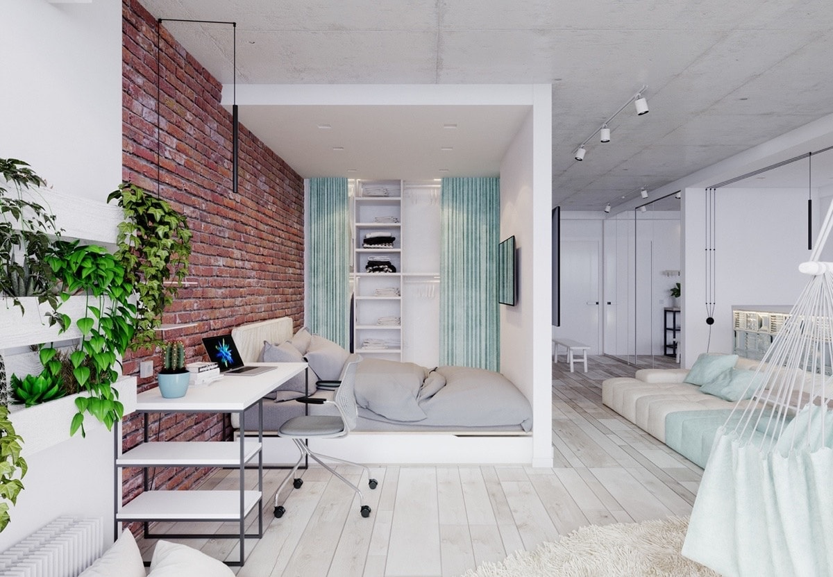The open plan is ideal for single people, a young family without children. In the studio apartment it is enough to equip only the kitchen, bedroom for a comfortable stay. The number, type of zones will depend only on the characteristics of the hosts' lifestyle.