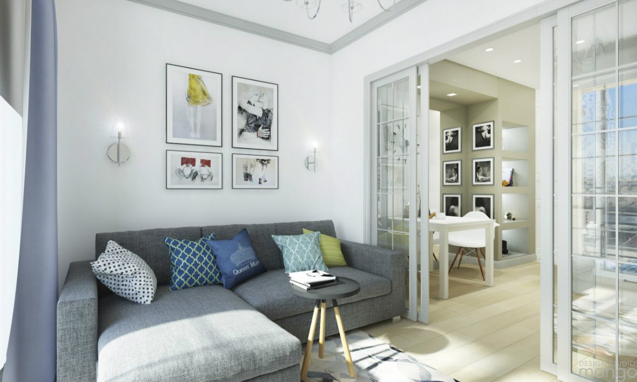 - The color palette of the interior should consist of white, gray shades. The light gamut will provide an opportunity to visually increase the space.