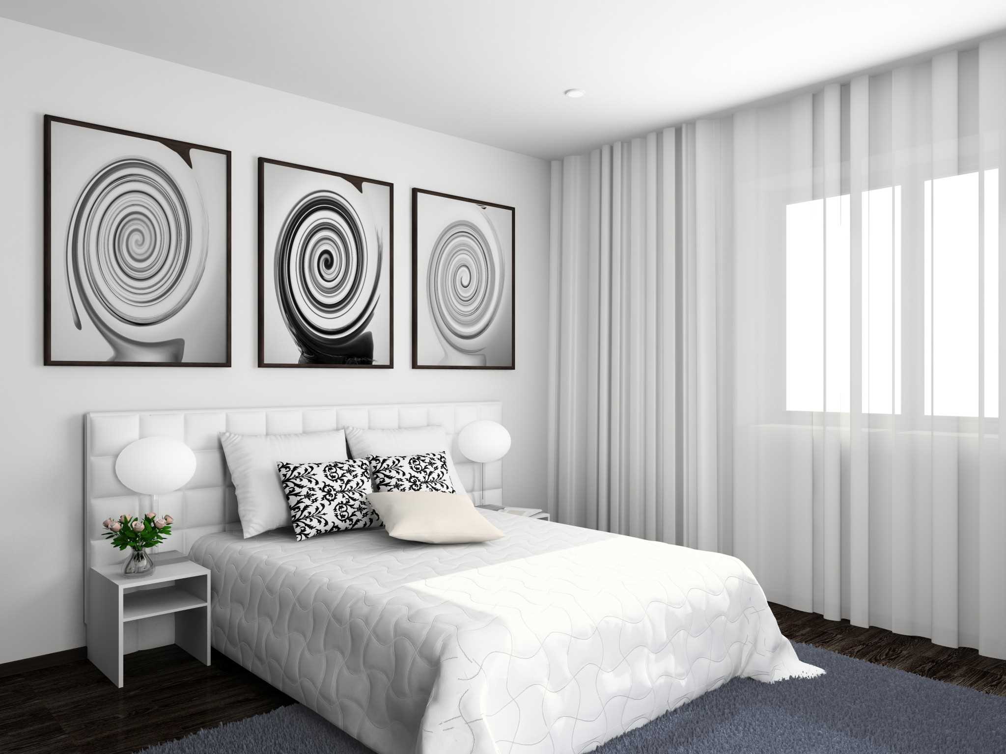 White walls, the same flooring, and a bed painted black - a good contrast, complementing each other, like Yin and Yang. The combination of white and black for modern room decoration is especially popular among young people. This technique is also used to decorate the bedroom, Classic, Loft, Pop Art, High Tech.