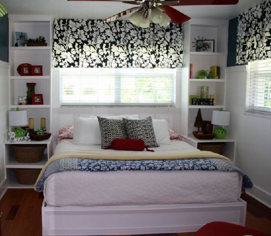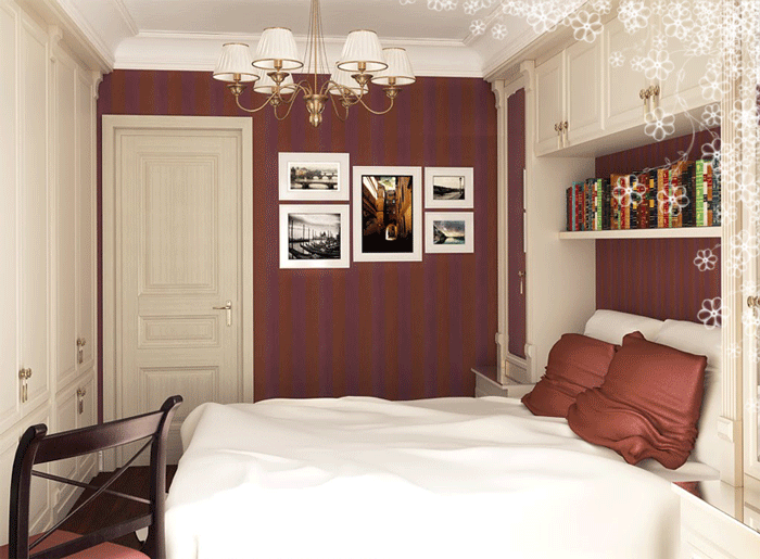 But if use exclusively bright shades in small bedroom designthen interior will be boring. Therefore, you should definitely add bright accents to the atmosphere. Examples can be seen on the below a photo.