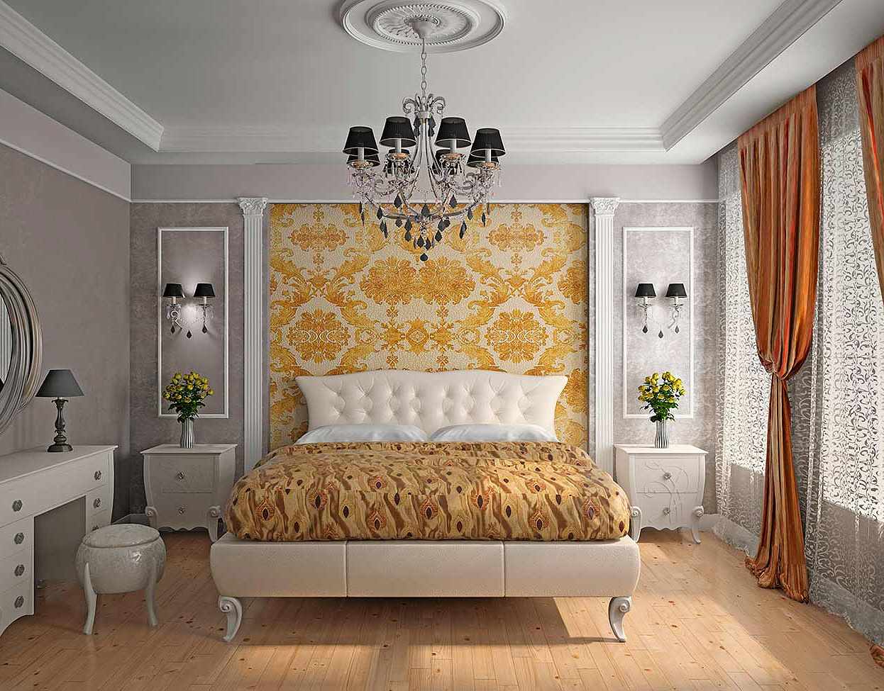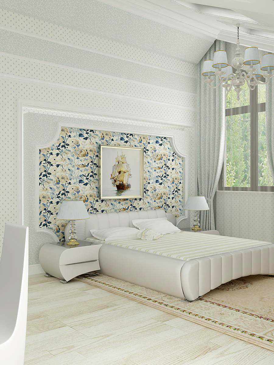- Walls can be varied in decoration, texture, shades and combination of materials. Liquid wallpapers and textiles, decorative plaster and gypsum stucco work well together, wallpaper for painting and decorative panels. Remember the visual effect of horizontal and vertical stripes. In the bedroom you can apply a glossy texture with a high degree of reflection of light, but they should not be dazzled when you go to bed. Patterned wallpaper is good to shade solid furniture, curtains and floor.