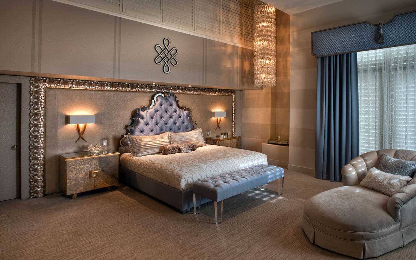 The main focus is on the headboard. Usually it is large, luxurious, elegant.