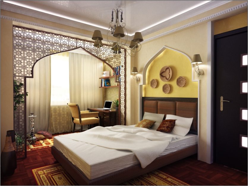 - In the inner corner. A particularly relevant solution for a single bed, when access to the bed from both sides is not necessary at all. Thus, you can save a lot of space and organize in the bedroom a work area or relaxation area with an armchair or sofa.