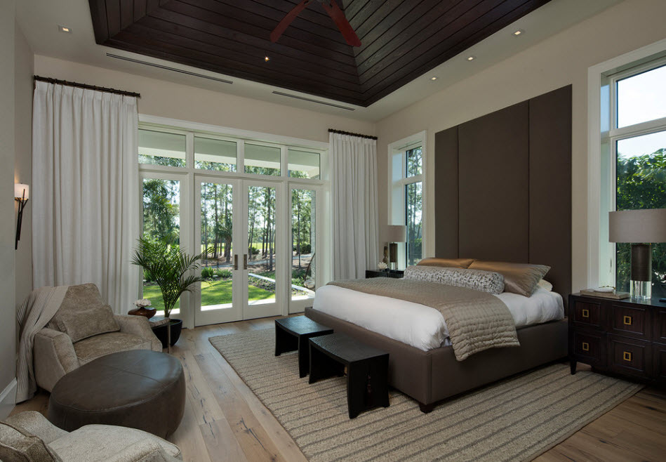 In a large room for rest and relaxation, zoning is appropriate, which can be emphasized by finishing the floor (podium) and a multi-level ceiling. The dimensions of the bed also depend on the size of the room, since there must be free passages on all sides. The large bedroom will fit a wardrobe or a small dressing room. A small room should not be cluttered with cabinet furniture.