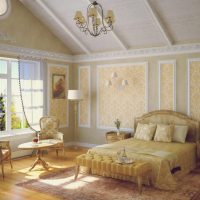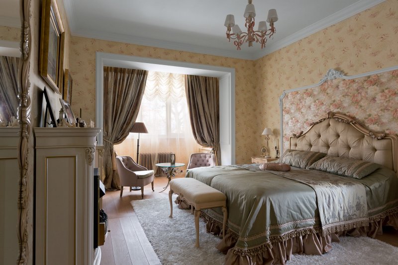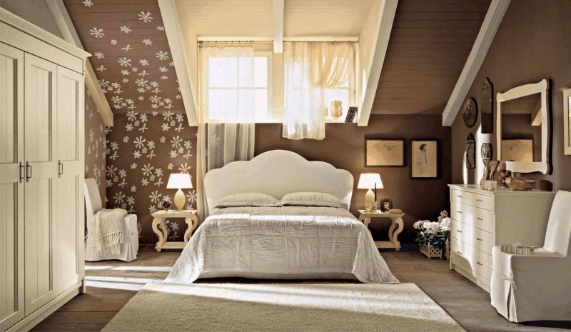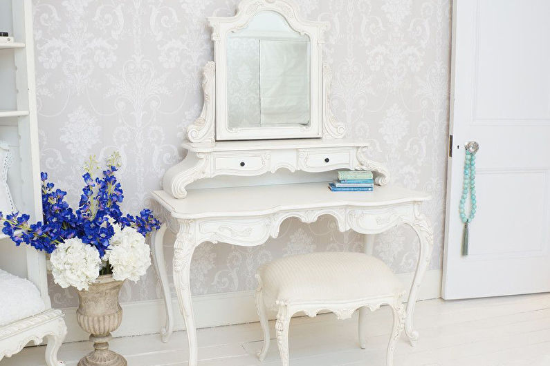 A tall, roughly knitted cabinet with carved legs fits perfectly into the overall ensemble. A dressing table and an original mirror perfectly complement and enliven the interior. Facades are often painted in pale shades or make decoupage of doors. If there is a large area, the decoration of the room can be supplemented with a bedside table or even a tea ensemble of two armchairs and a table, but this is possible only when the bedroom is quite large in area. The same is true for studio rooms, which have recently been popular not only in urban new buildings, but also in country houses to save space and optimize its use.