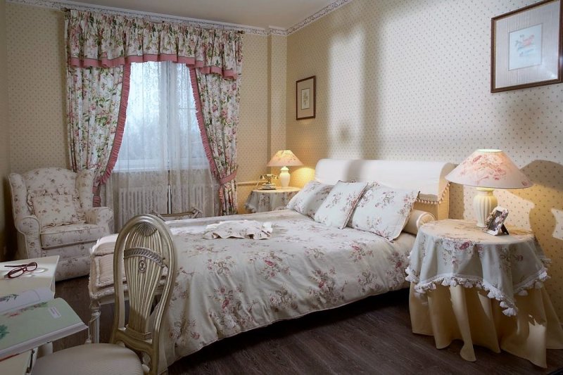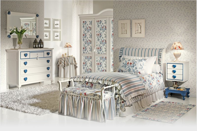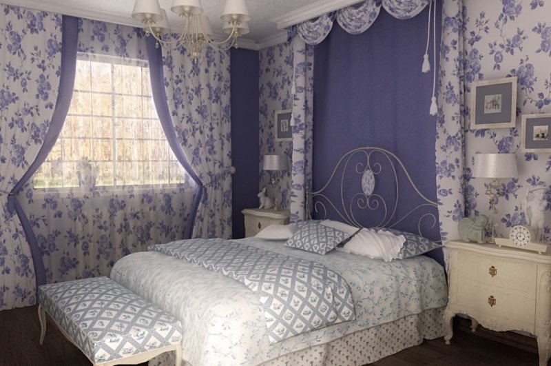 What bedroom will do without a lot of textile filling? Bedspreads and decorative pillows on the bed, curtains on the windows, furniture upholstery - everything should be done in uniform colors. This style loves a small and large floral print. The main rule is not to oversaturate the interior! If the walls are painted with monophonic paint, then make the design of the same color, but with a pattern, for example. In the case of using colorful wallpapers, it is better to take a coarse homespun cloth of monophonic coloring for the rest.