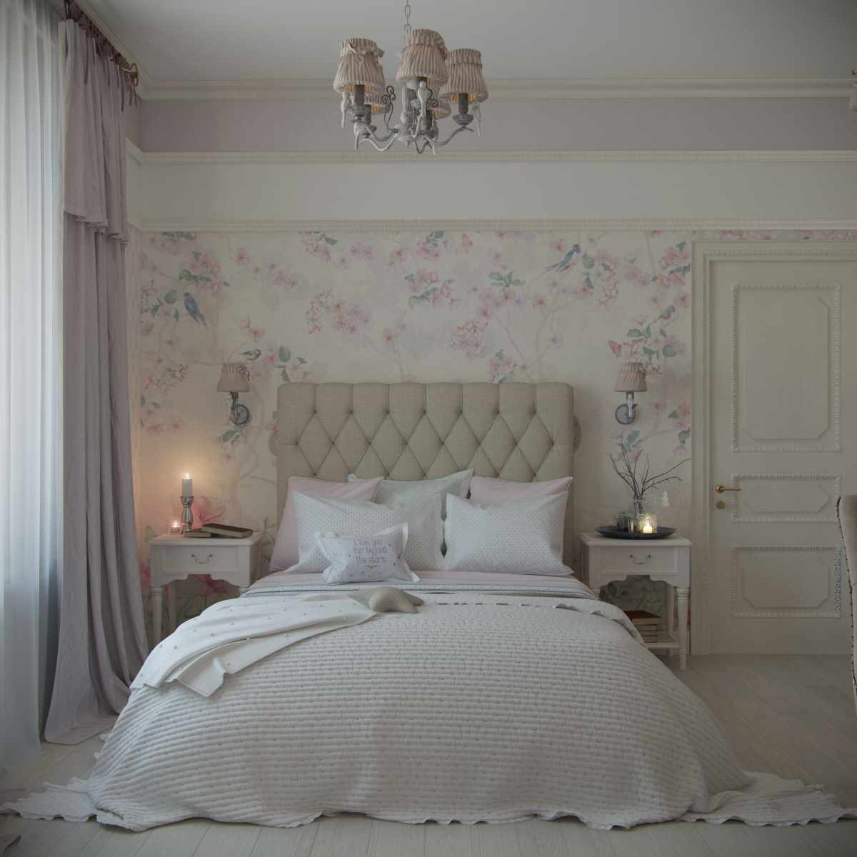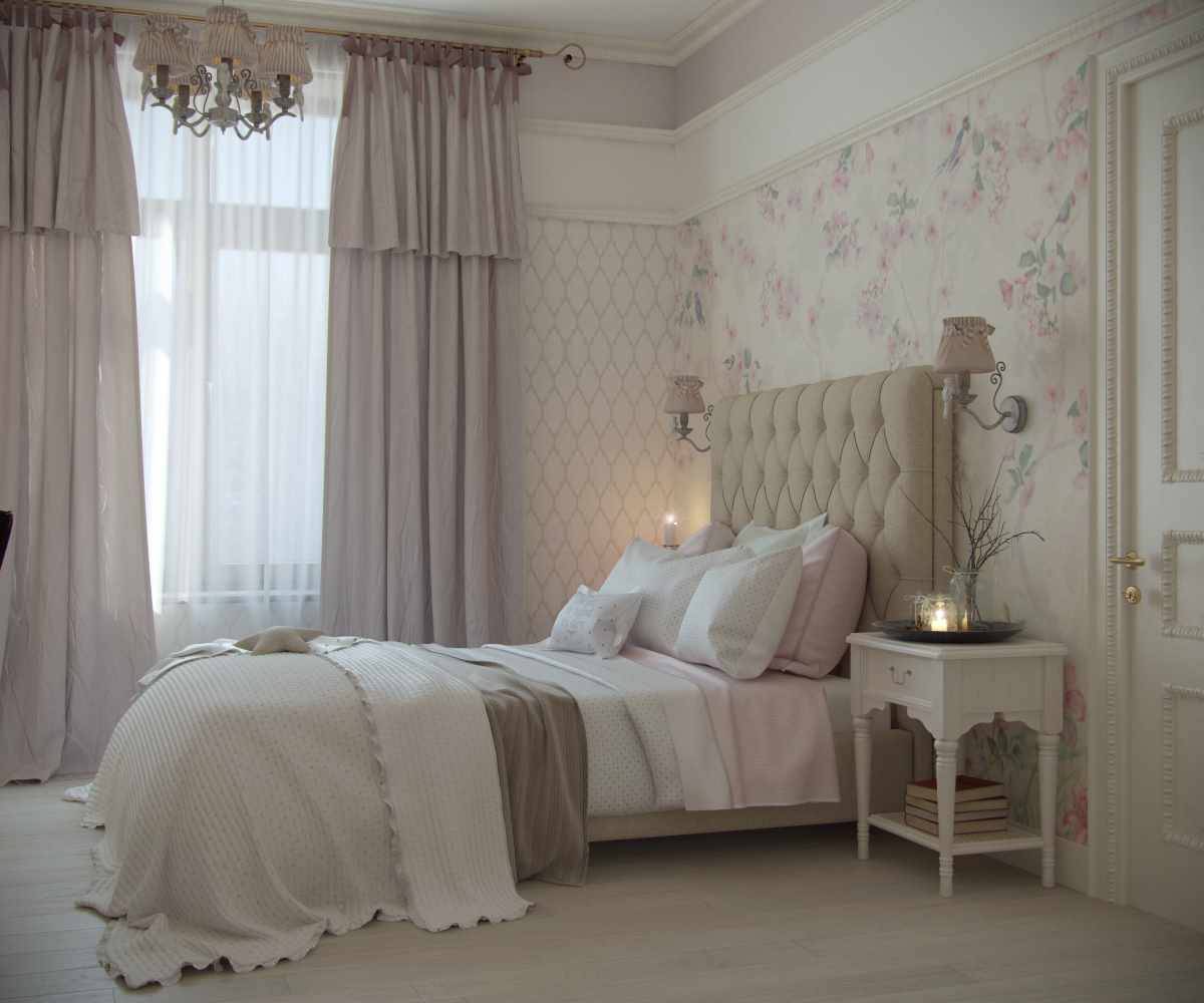 Textile or wood panels will help highlight the wall at the head of the bed or make it high. Fabric panels with a floral pattern, ornament, give the room a unique charm of a ladies' boudoir, and if they are done in a patchwork style, this will add a touch of country style to the room.