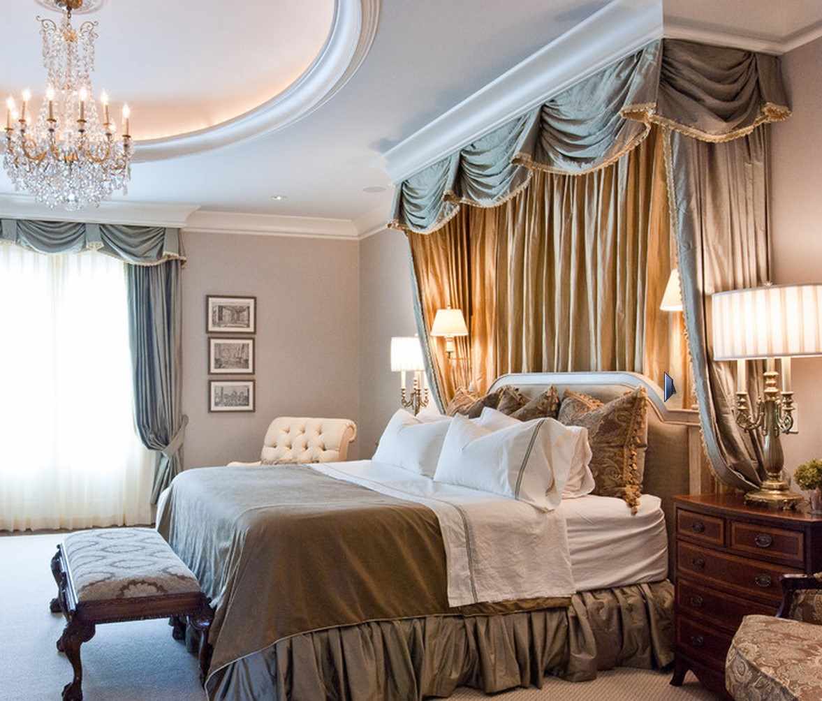 The presence of gilding. The headboard has fancy gilded shapes that can be mirrored. Aged mirrored surface in a frame with gilding, looks gorgeous. The wall can be decorated with a mirror panel, which will add room and air to the room.