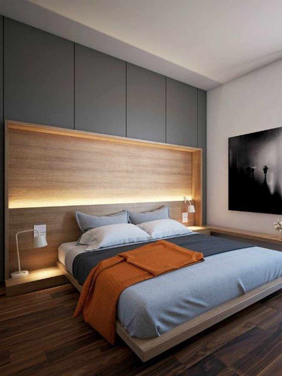 The headboard made of wood moving onto the ceiling perfectly complements the overall interior of the room.