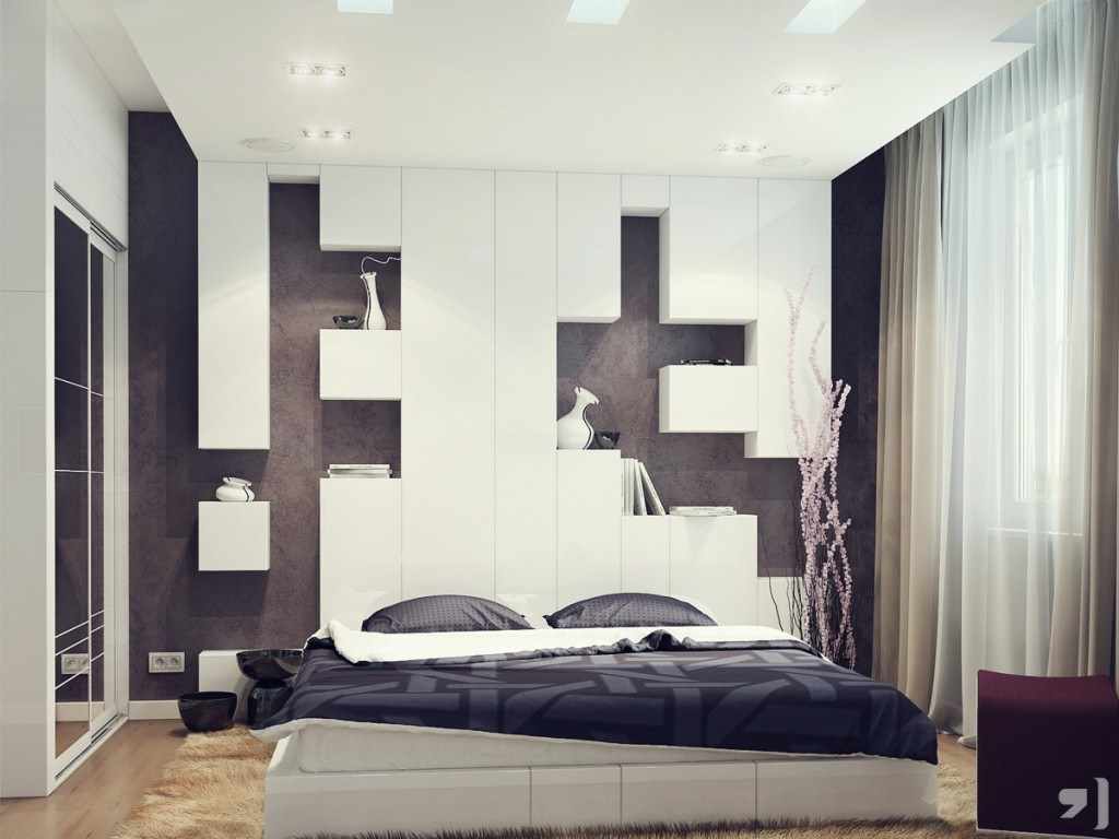 The headboard in a minimalist style looks very unusual and beautiful.