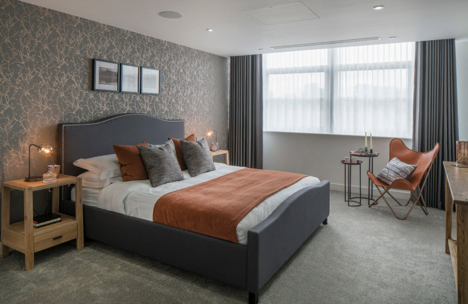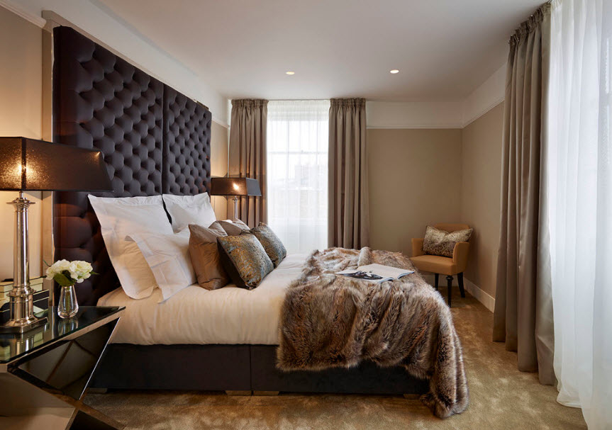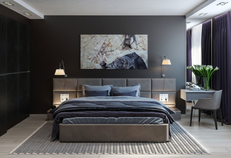 The gloominess of gray, black, and brown does not make these colors inappropriate in the setting of a bedchamber. They will add a little drama to the design, a sense of comfort. The main thing is not to overdo it. Too dark a bedroom is unlikely to leave a good impression, will contribute to relaxation.