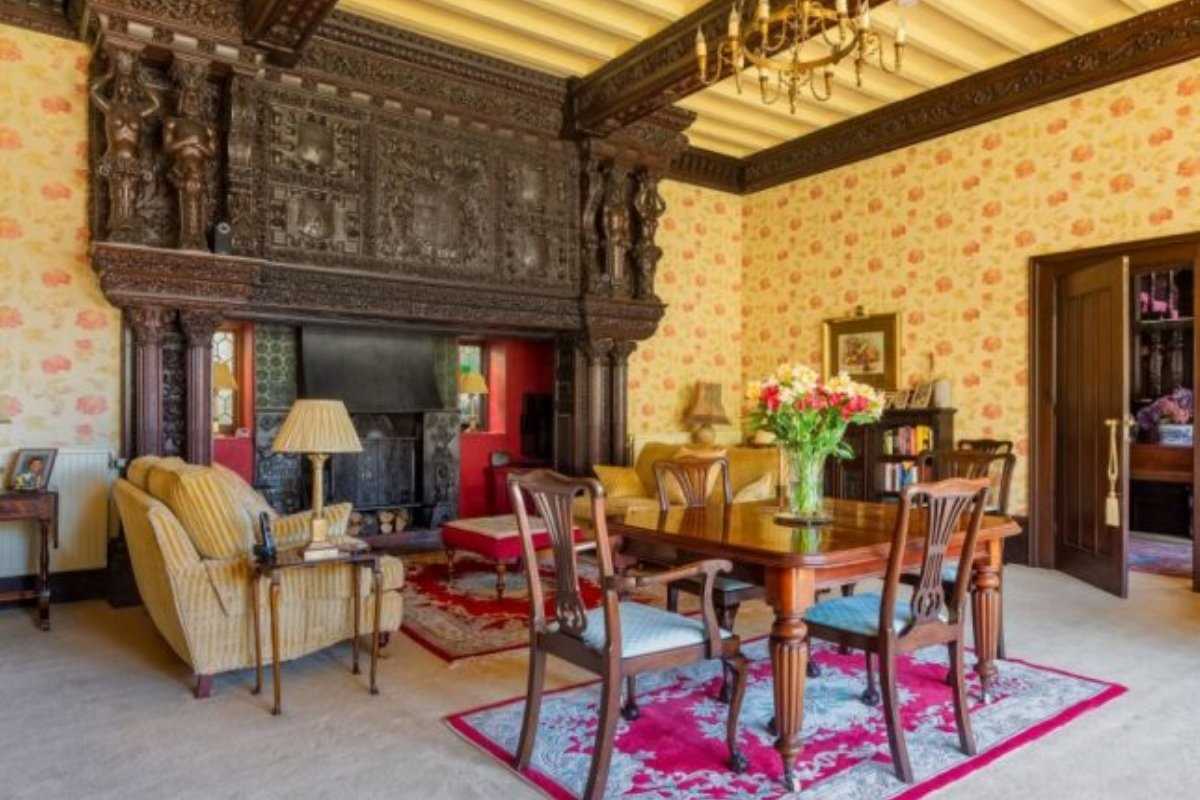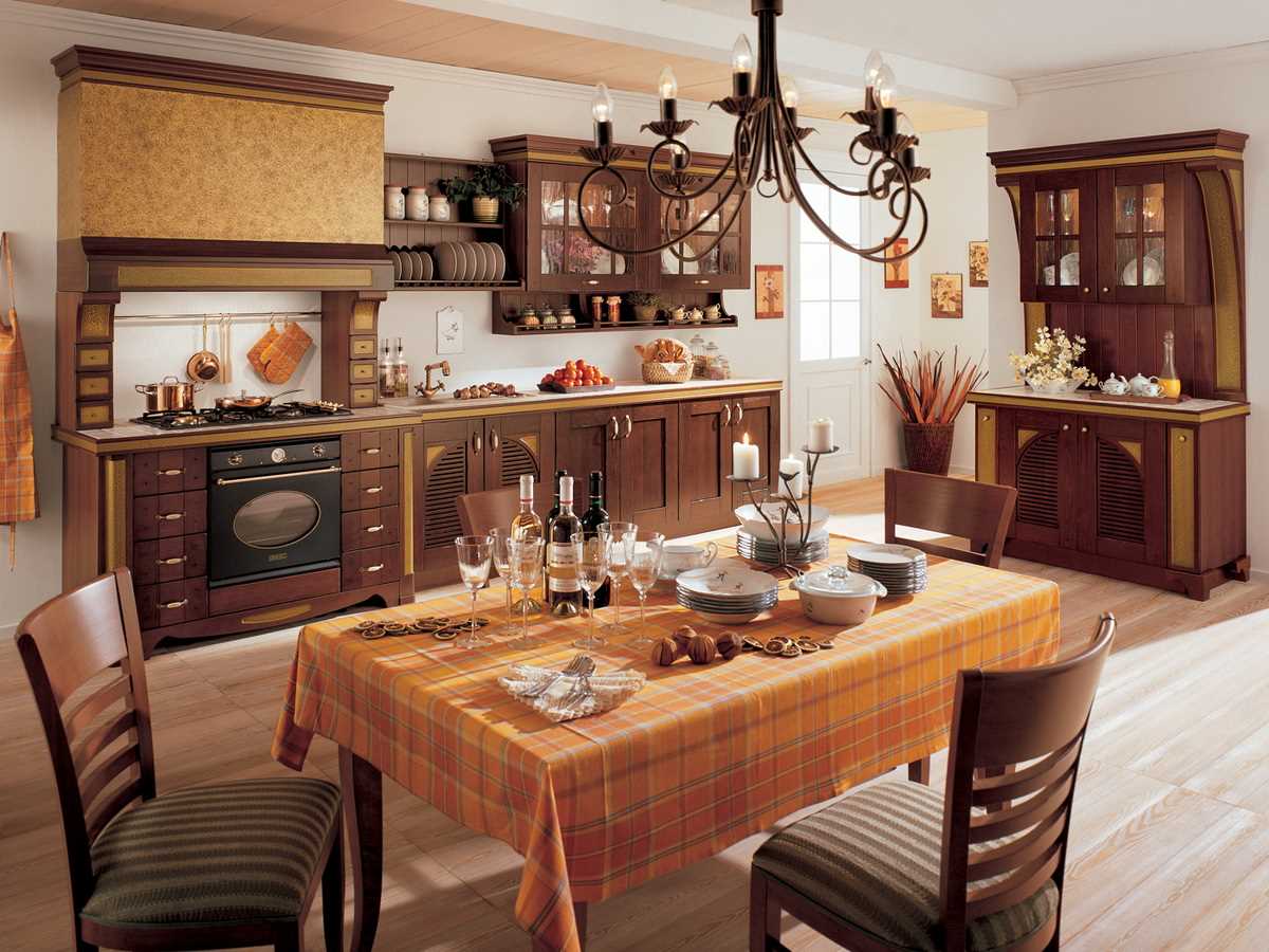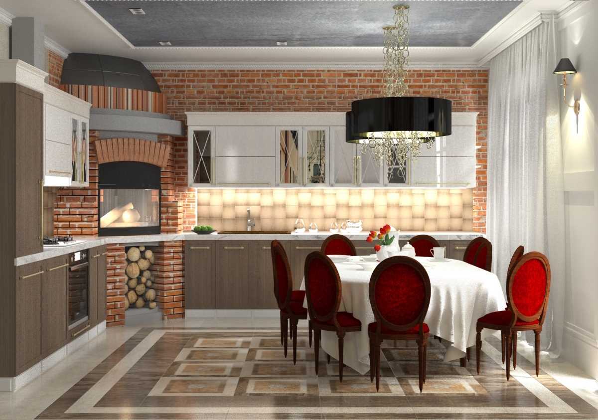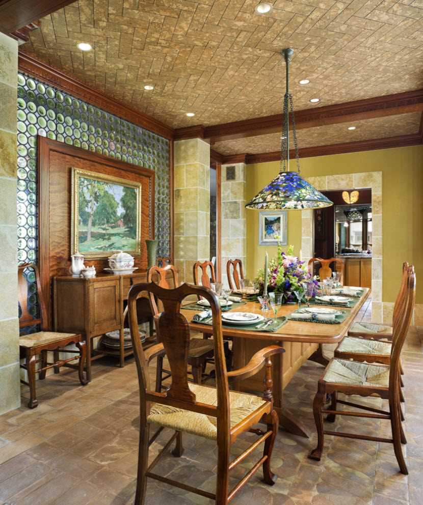 In the dining area, a rude table surrounded by many massive chairs will authentically look. To illuminate the space, it is better to use a large ceiling chandelier with bulbs resembling a candle flame.