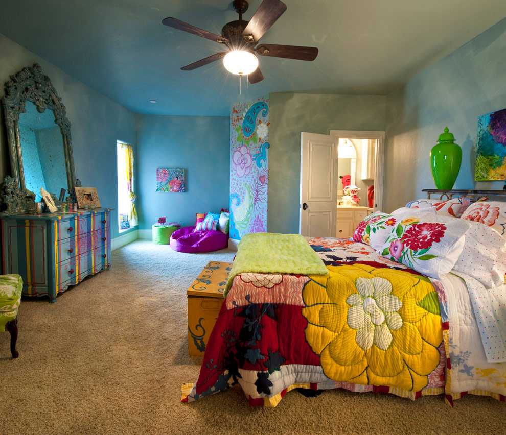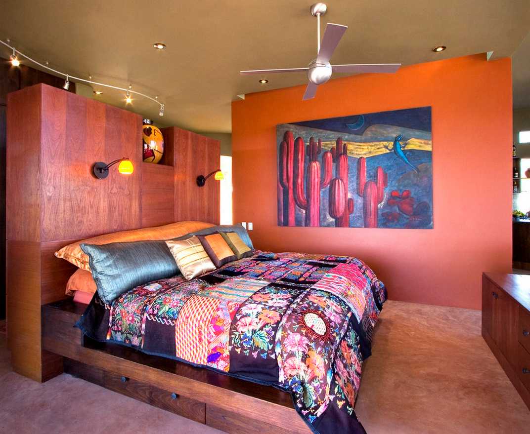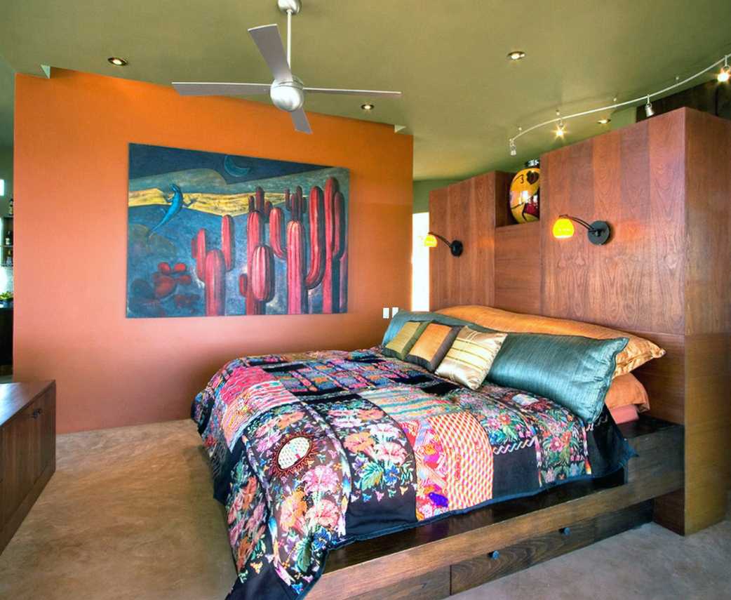 Several different paintings on the walls, hand-made products on the shelves, as well as rugs and multi-colored tapestries emphasize individuality and complement the picture. The bedroom should be cozy and this comfort will necessarily be combined with many accessories placed in the most unexpected places.