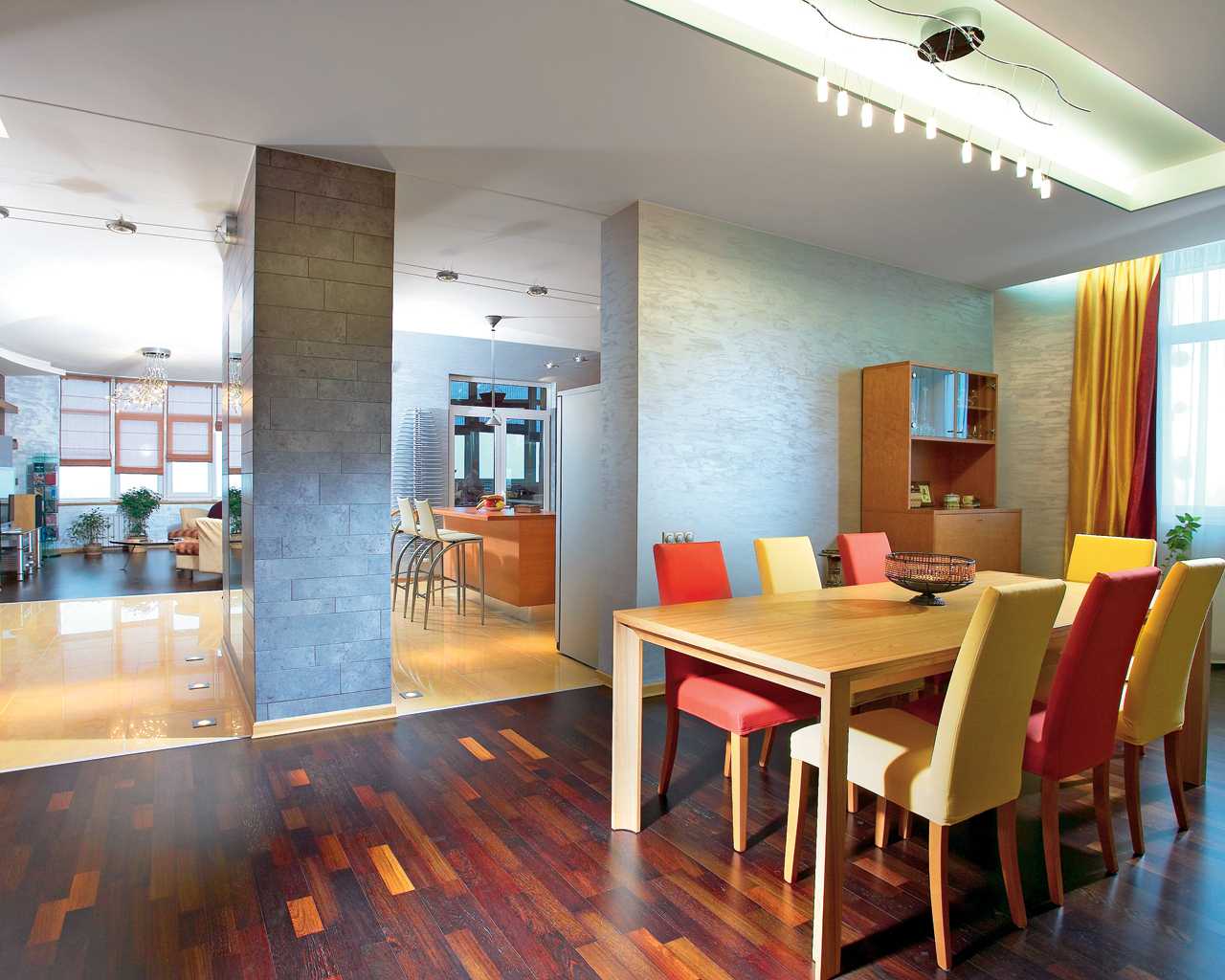 There are no restrictions on wall and ceiling décor. Often use wood, glass coatings, ceramic tiles and more. Basically, the decor of the walls and ceiling depends on the remaining components of the interior. So, if you are going to focus on furniture and accessories, then the walls and ceiling should be left dim and plain. It is also possible to make the main color accent on the walls and ceiling. In this case, when choosing utensils and small things for the home, you should focus on calmer colors. This technique of forming the room will allow you not to overload the space with color, not to make it lurid and unpleasant.