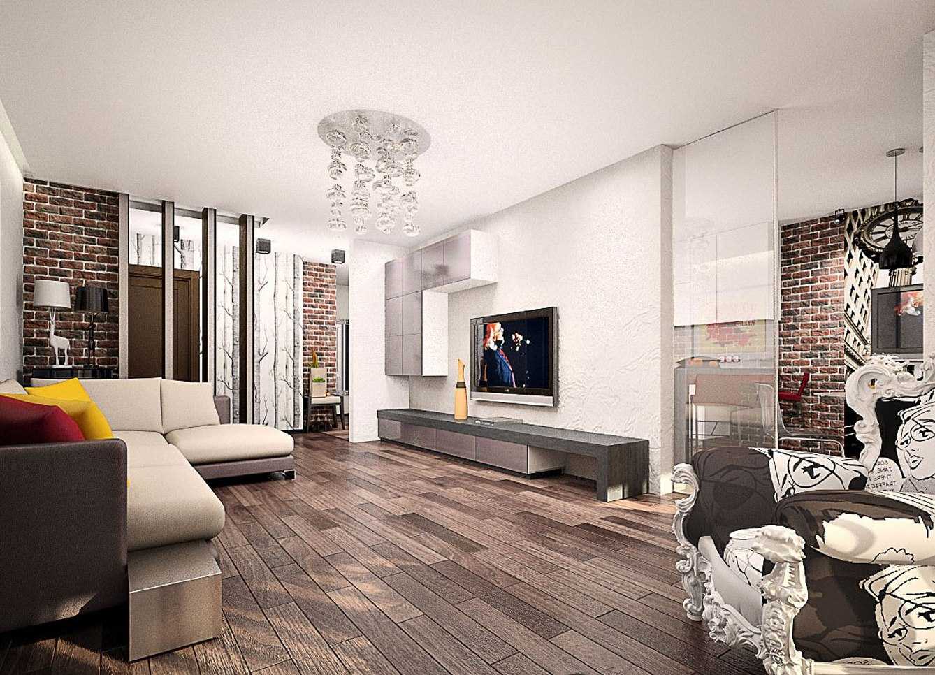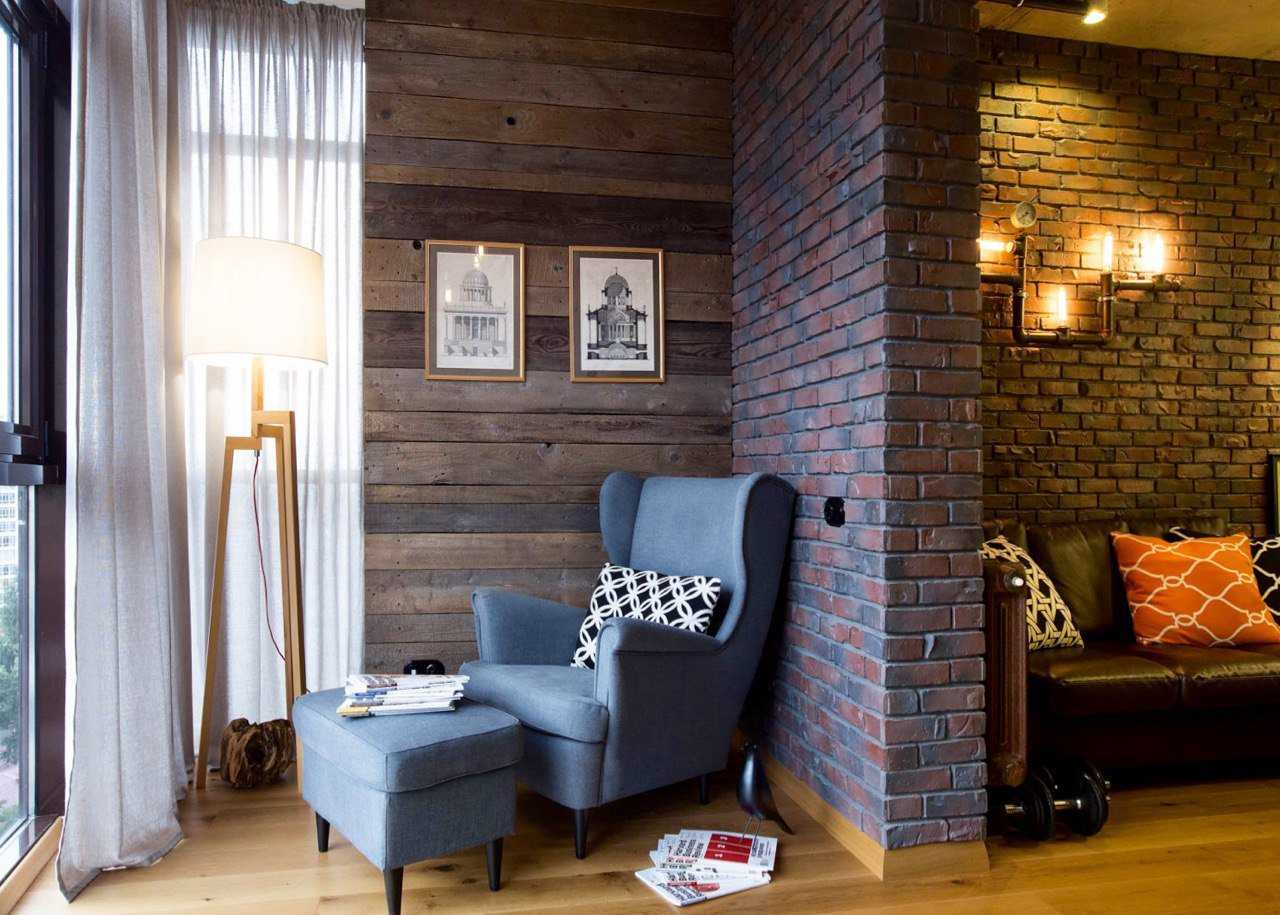 Brick wall in a loft style living room interior
