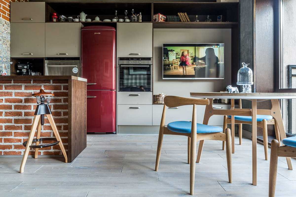 It is typical for the loft style that the dining area is rarely placed in the kitchen - if the family is not large, more often the bar counter is also a place for eating and performs the function of zoning the room. As chairs, high bar stools with forged or chrome legs can be used.