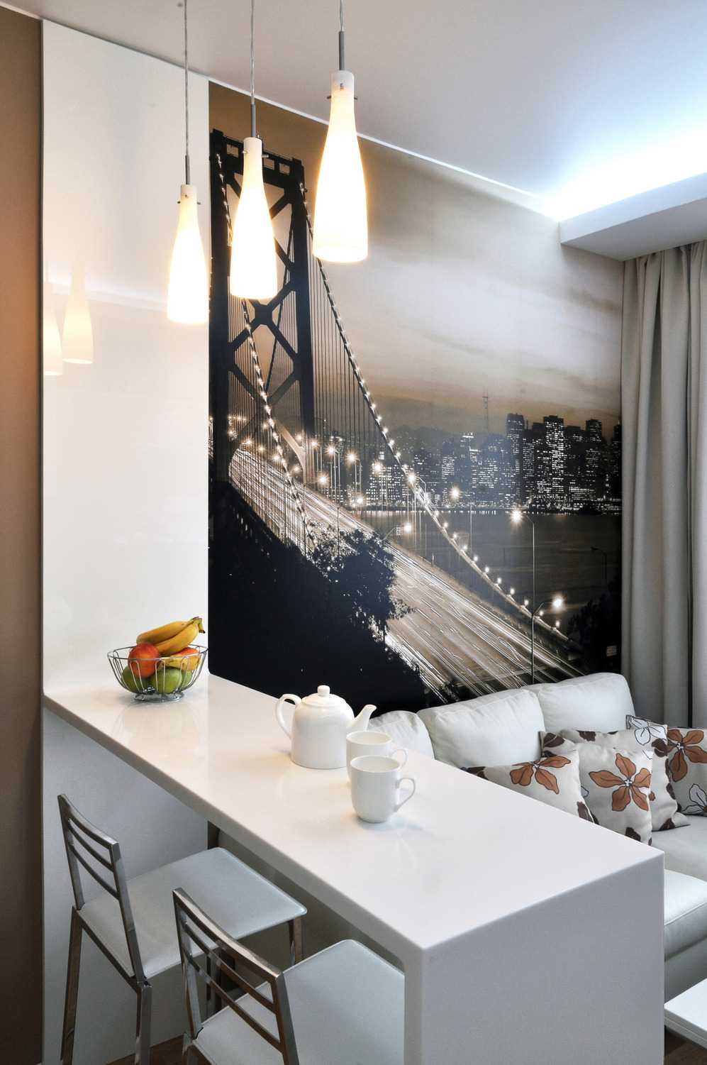 A kind of partition separating the kitchen from the living area can be a bar counter on a brick basis. A single space was deliberately created in the loft style, so only partitions for organizing the sleeping area can remain appropriate, while the rest is a matter of taste for the owners.